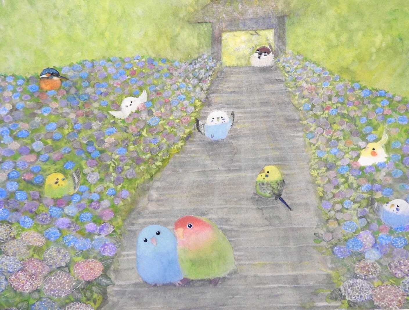 紫陽花が満開の紫陽花道を楽しむ小鳥たち。