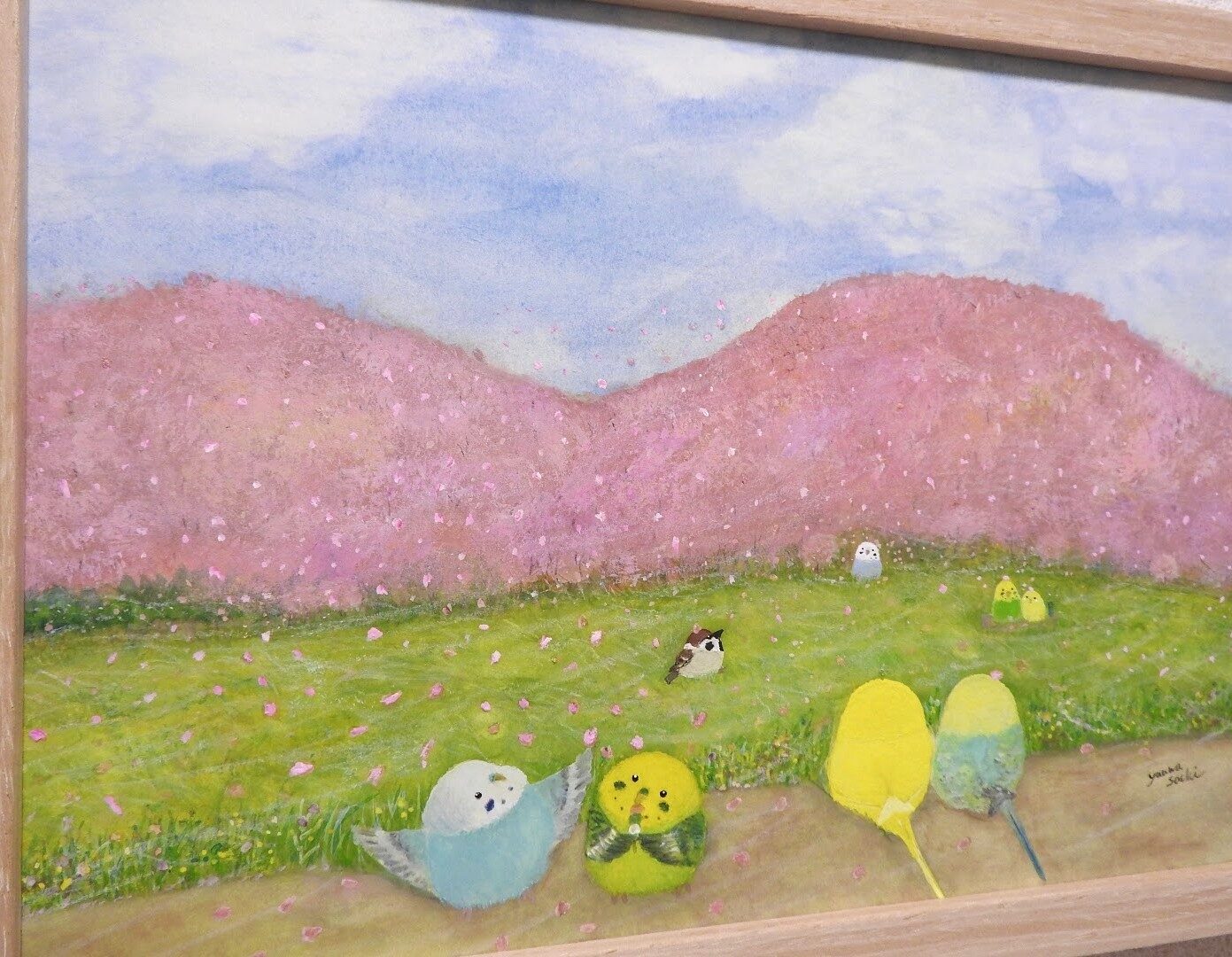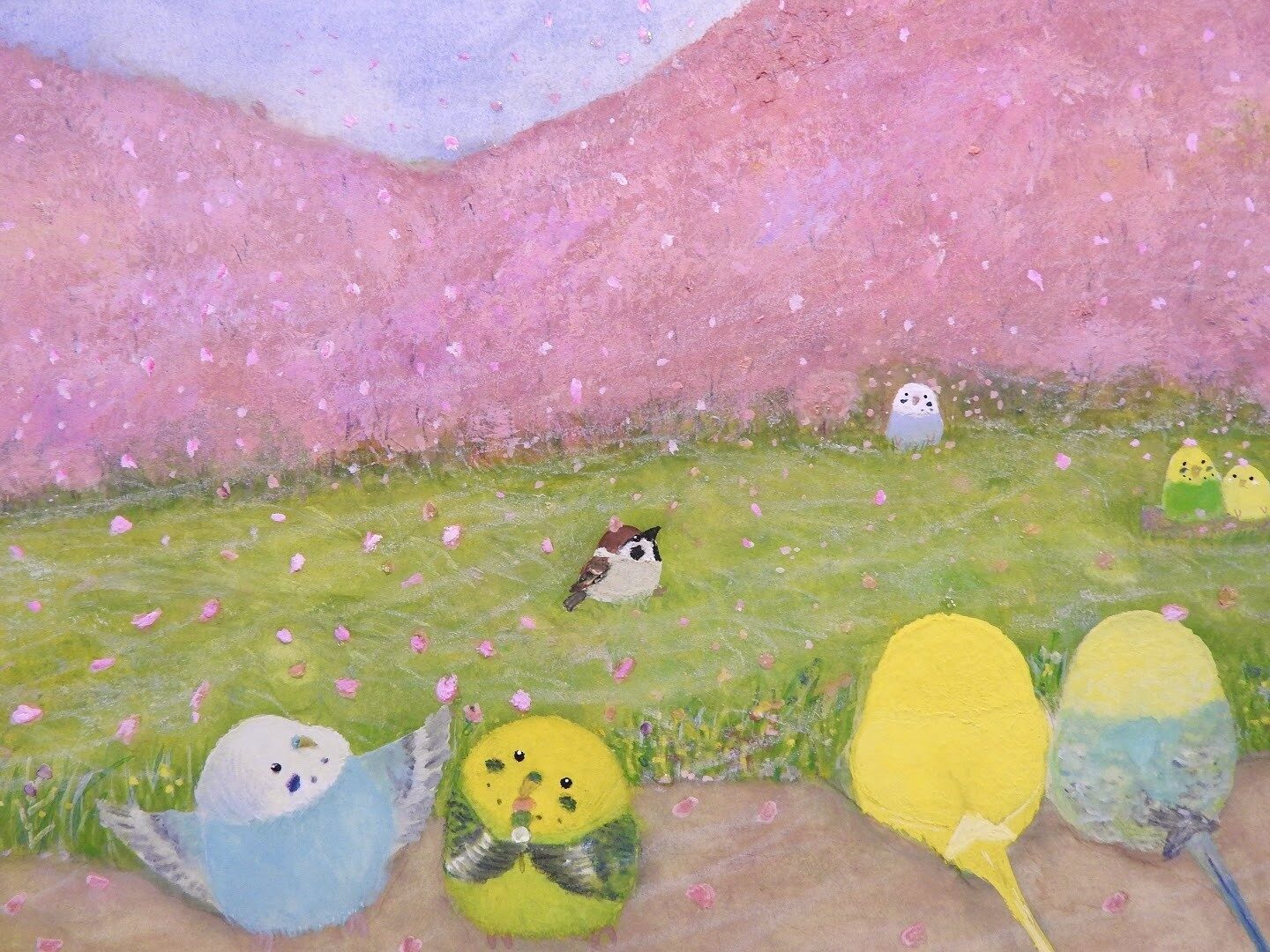 桜と風に舞う桜吹雪、セキセイインコたち、スズメを描いた1点もの絵画です。