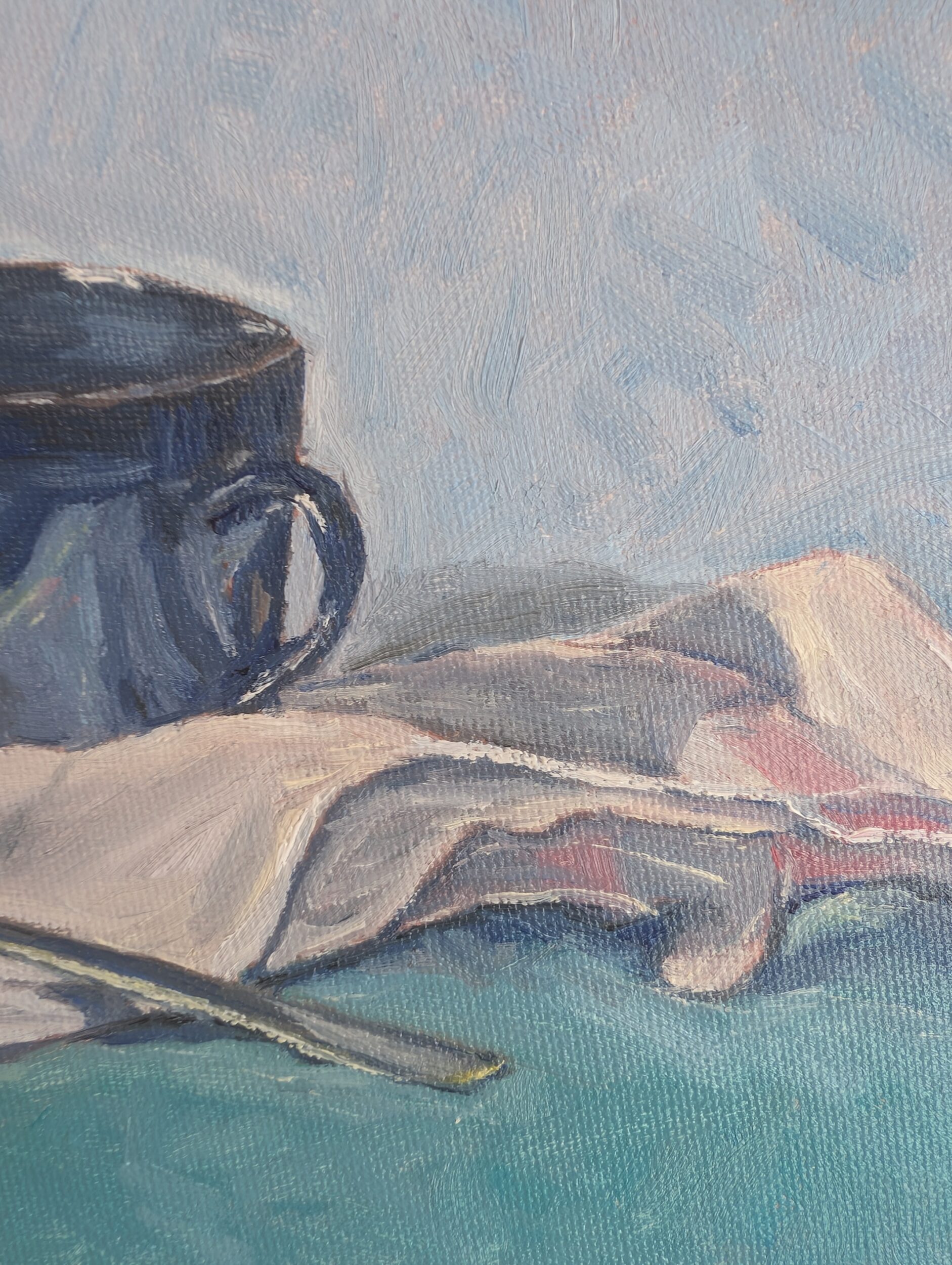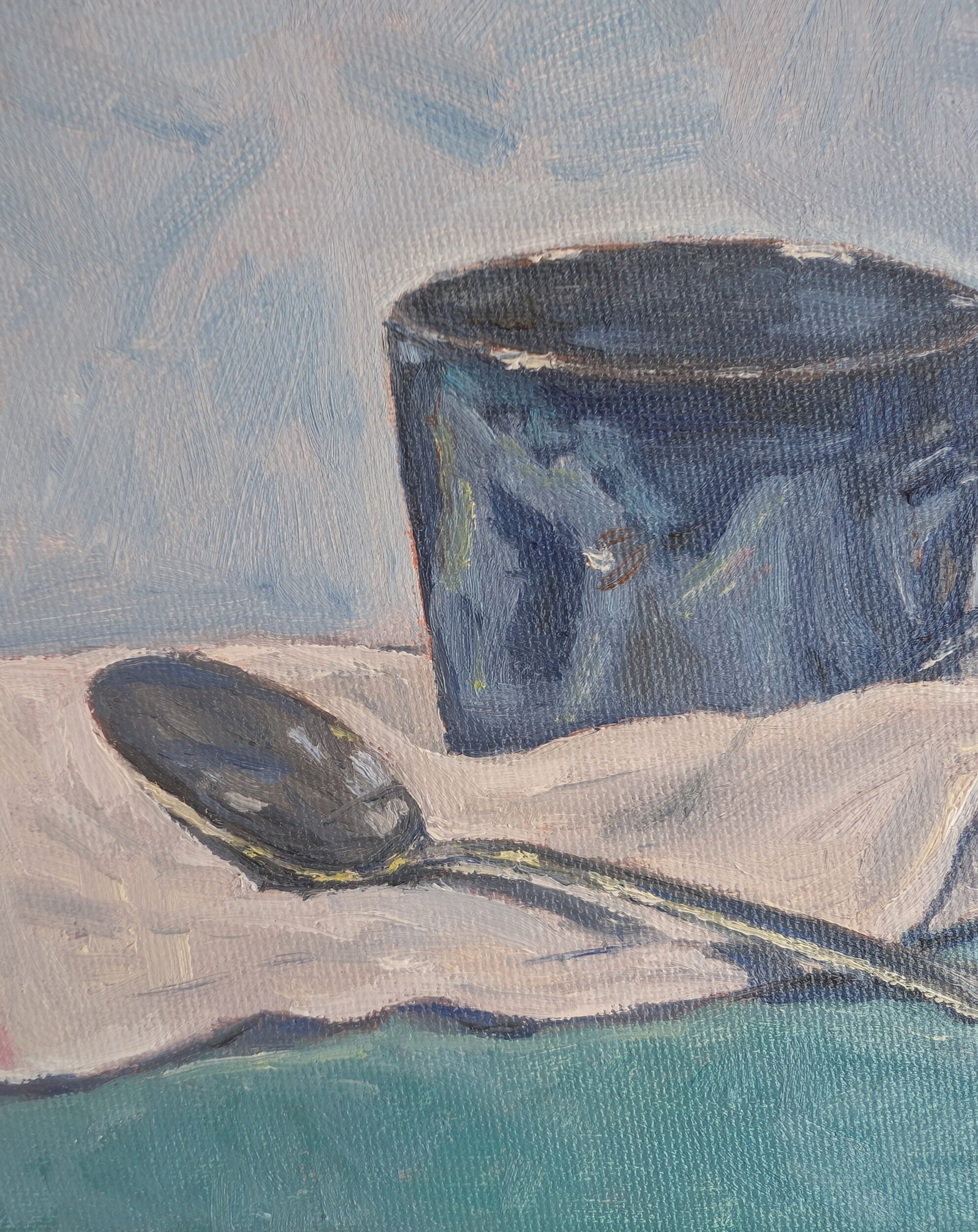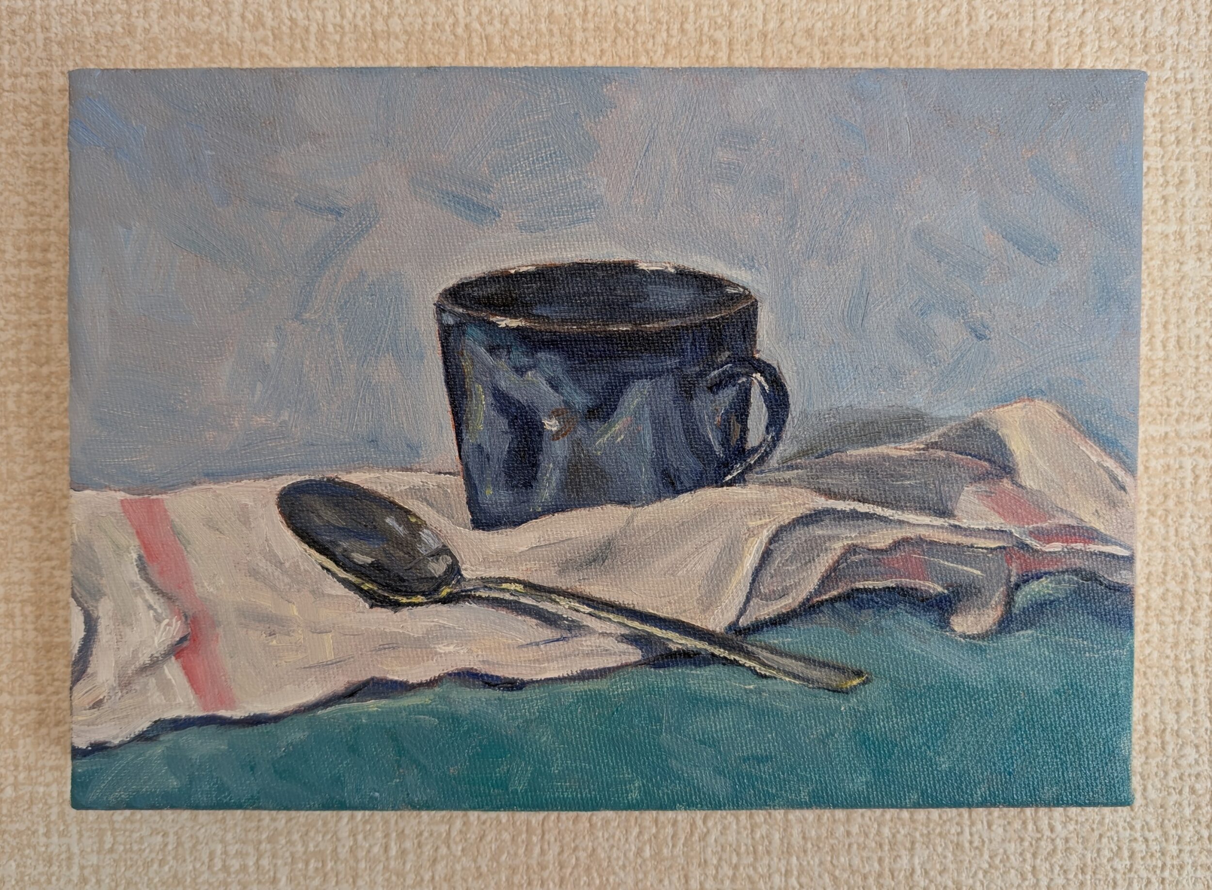 お気に入りの藍色のコーヒーカップと、スプーン、布巾を描きました。静物画です。