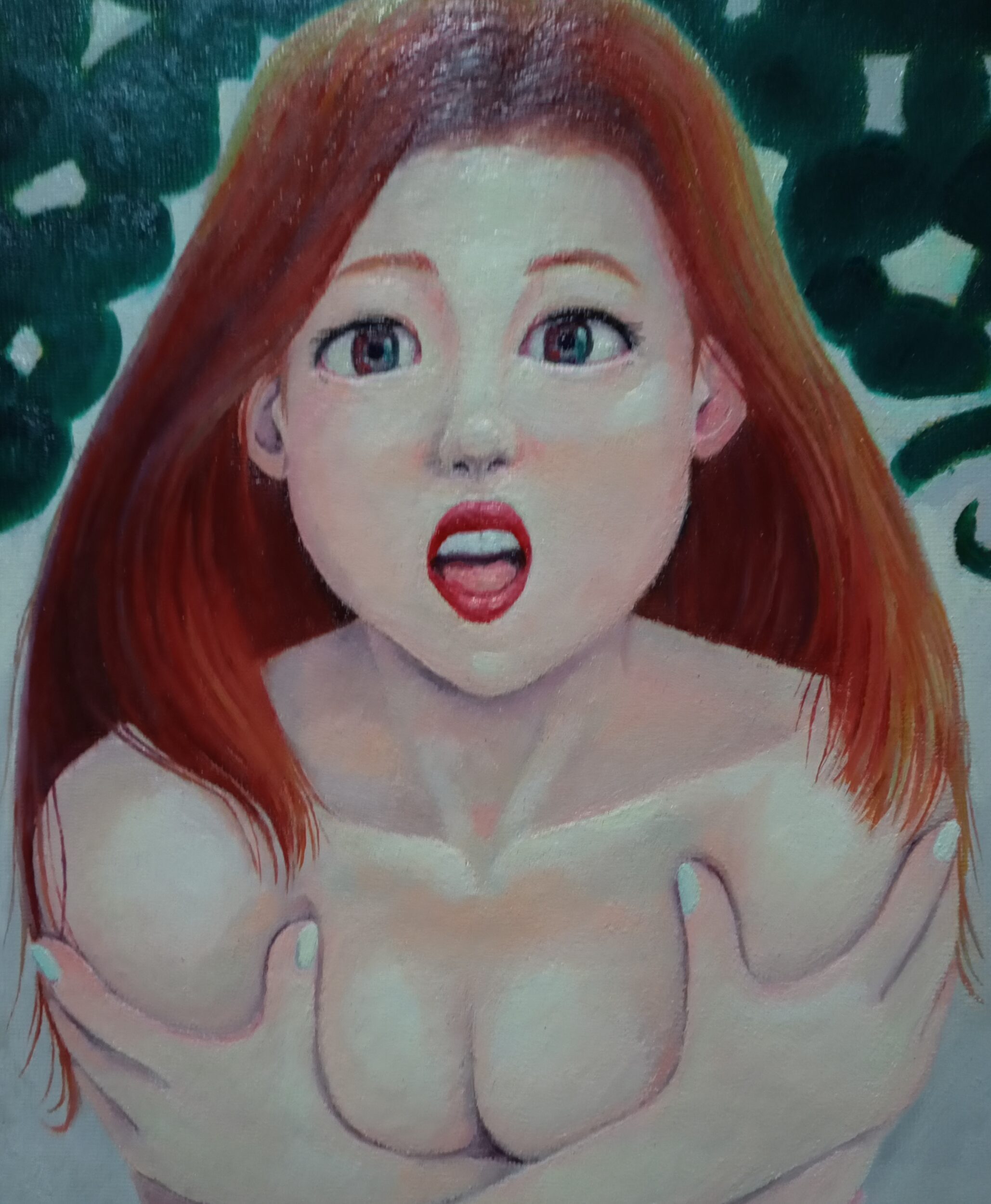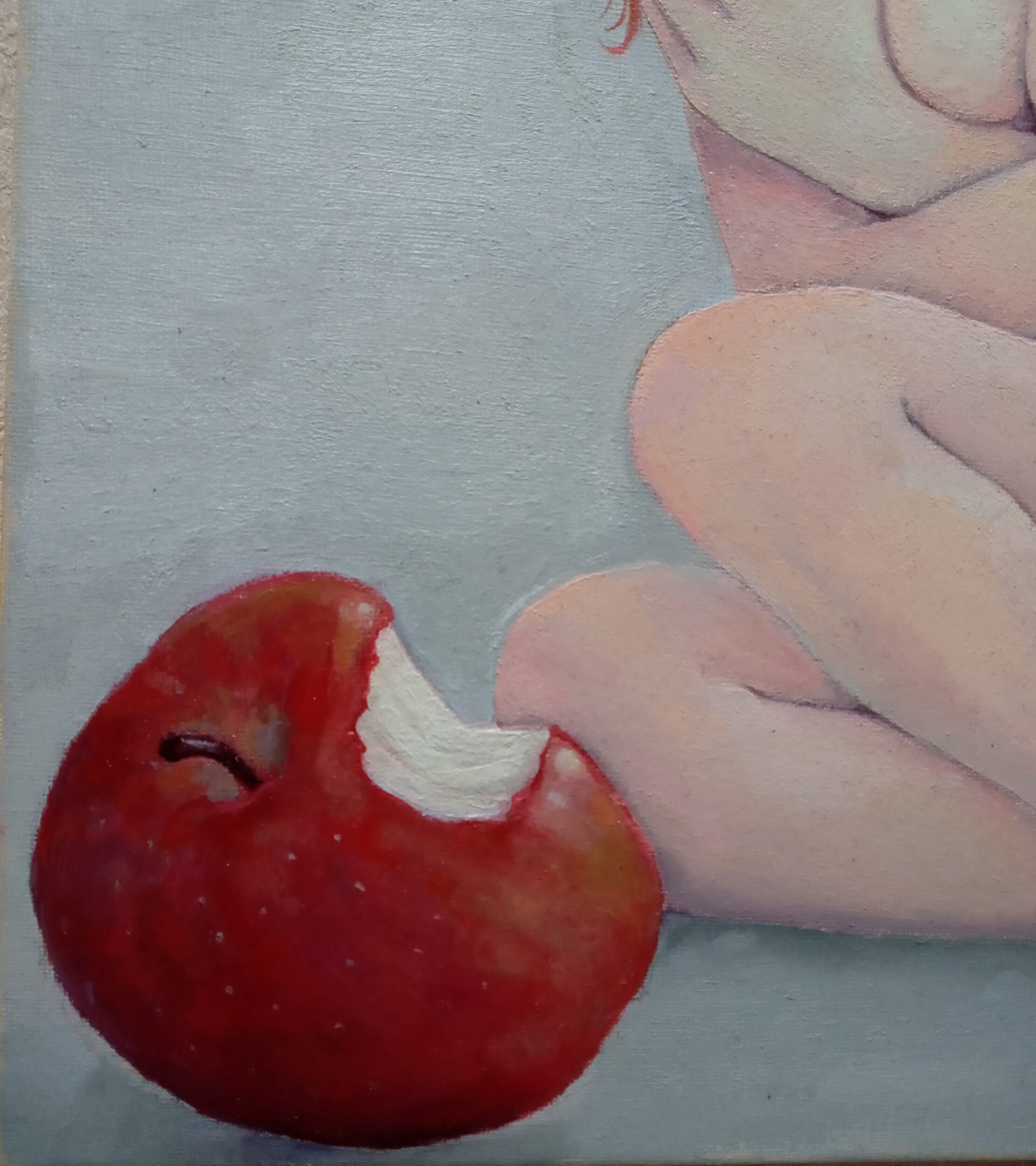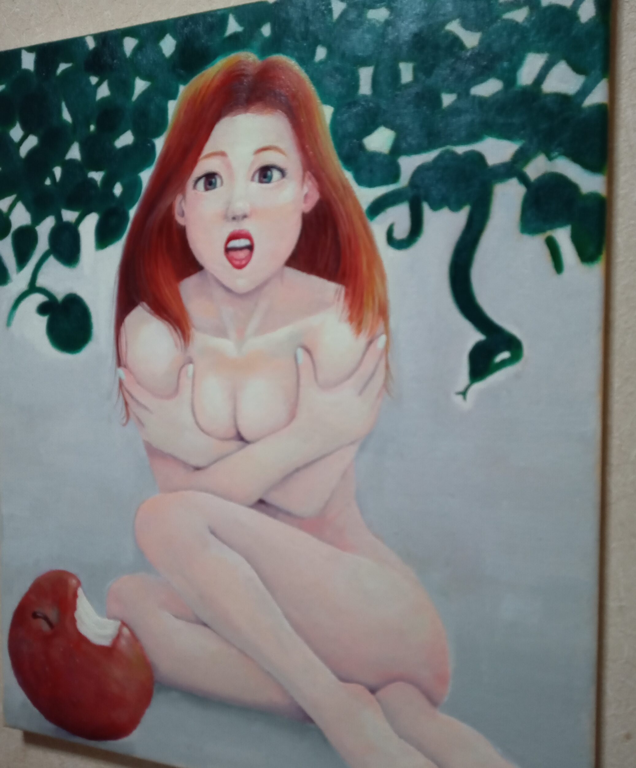 油彩画キャンバス F8号 series Women㉕ 今を生きる女性をスパイスを効かせた愛で表現しました。 ヘビの誘惑に負け禁断の果実を口にしてしまったイヴちゃん…彼女の中で何かが芽生えました。アダム君も誘っちゃいましょう!