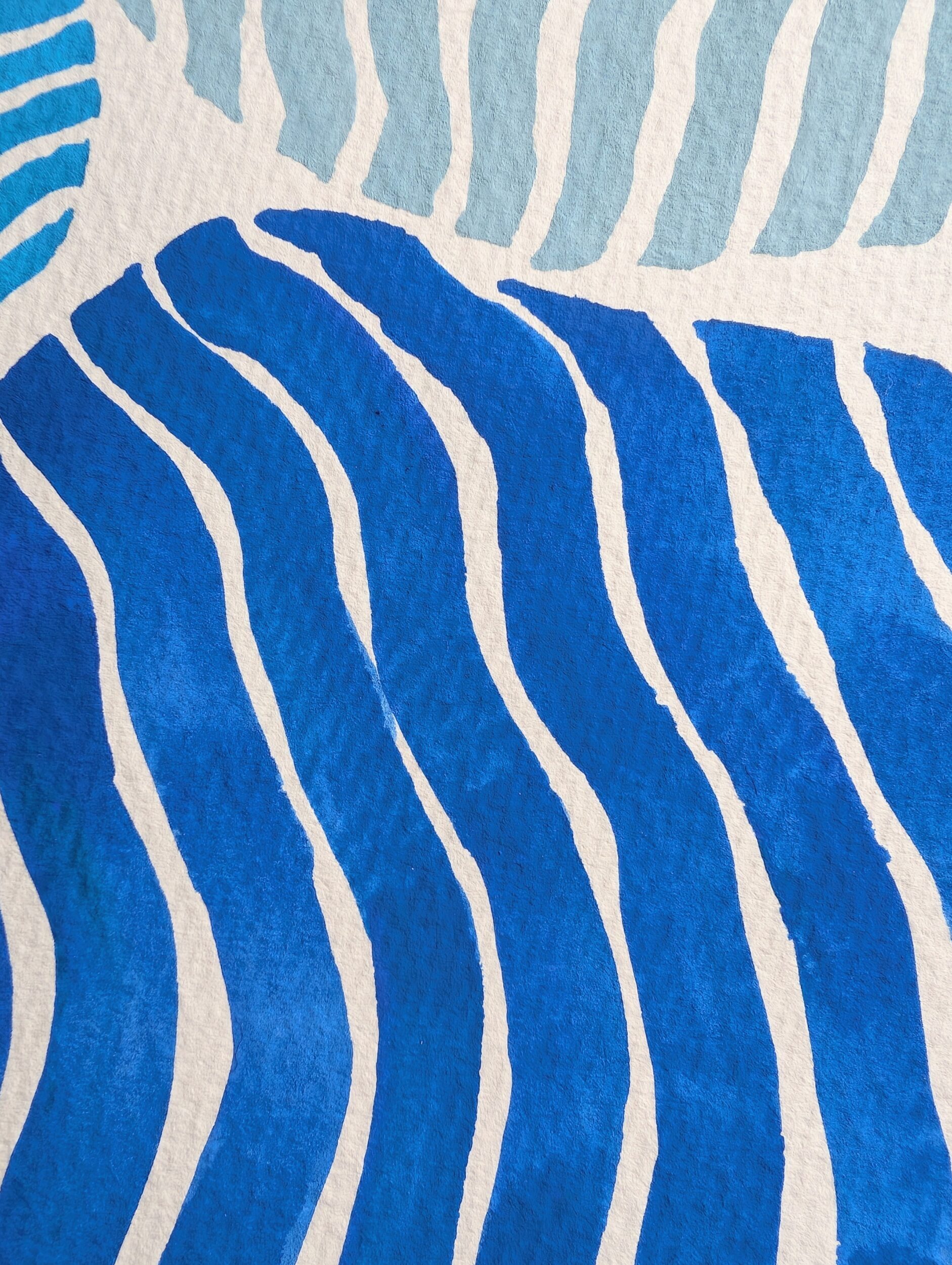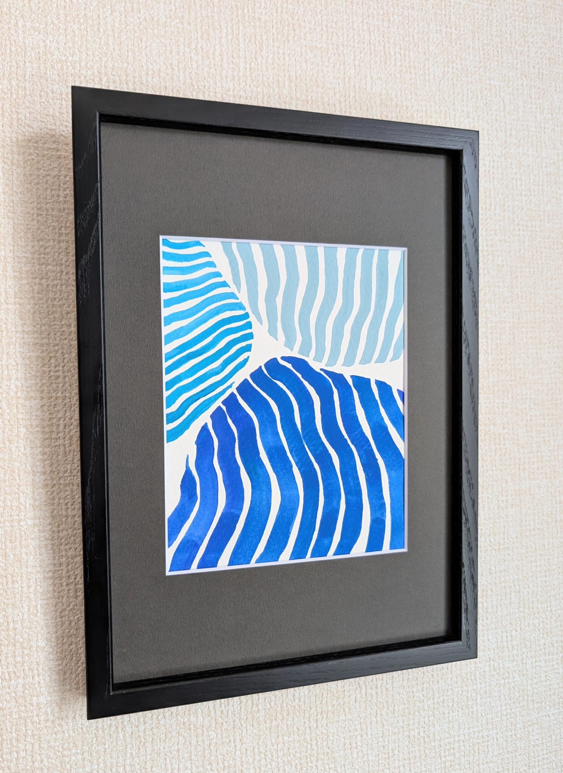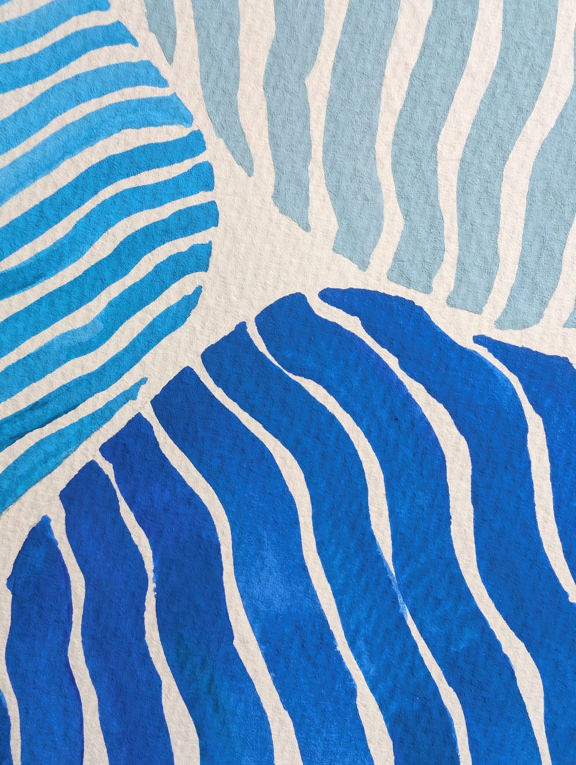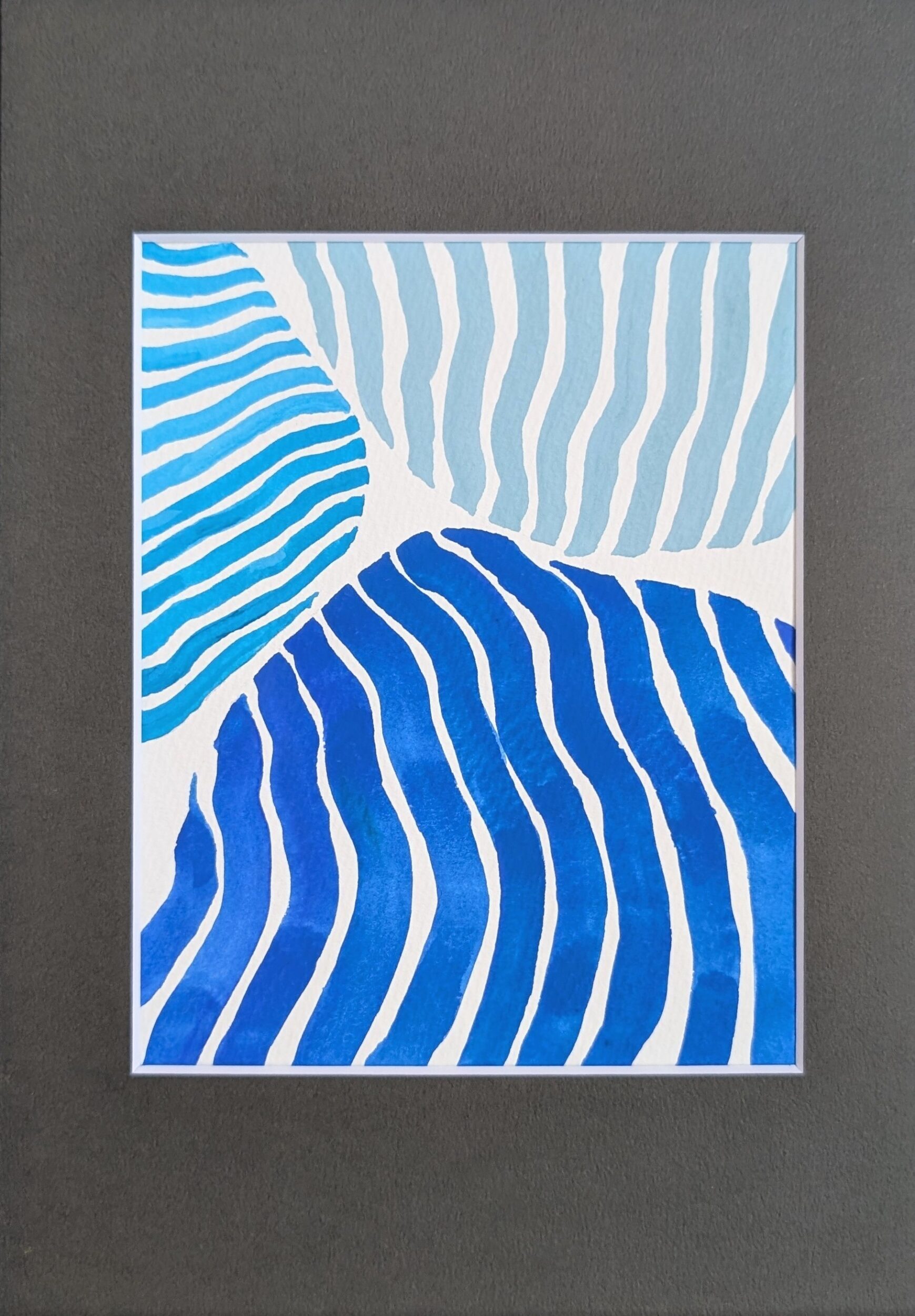 ブルーを基調とした3色から成るストライプと石(stones)をイメージし、自由に配置した作品になります。石と石、ストライプ同士の隙間が美しく、楽しげな作品となります。