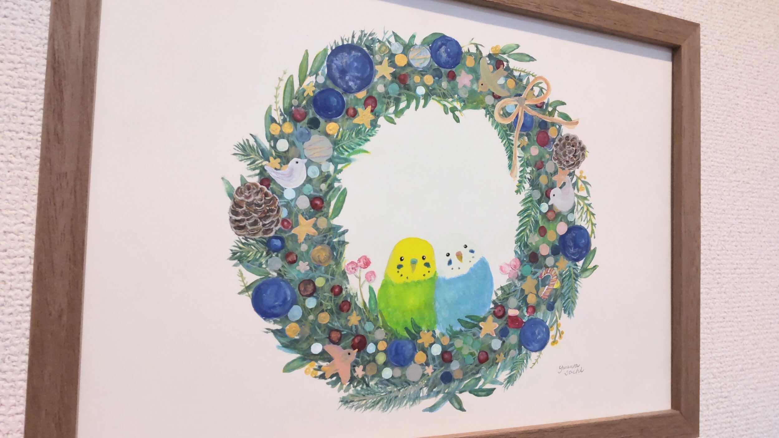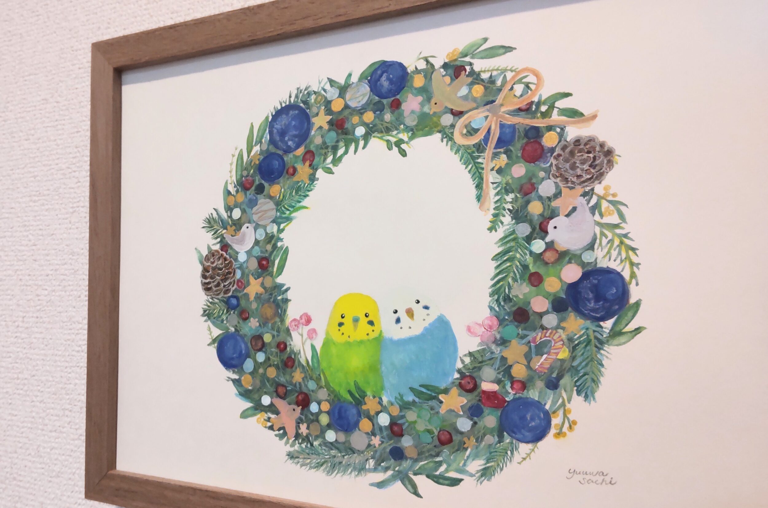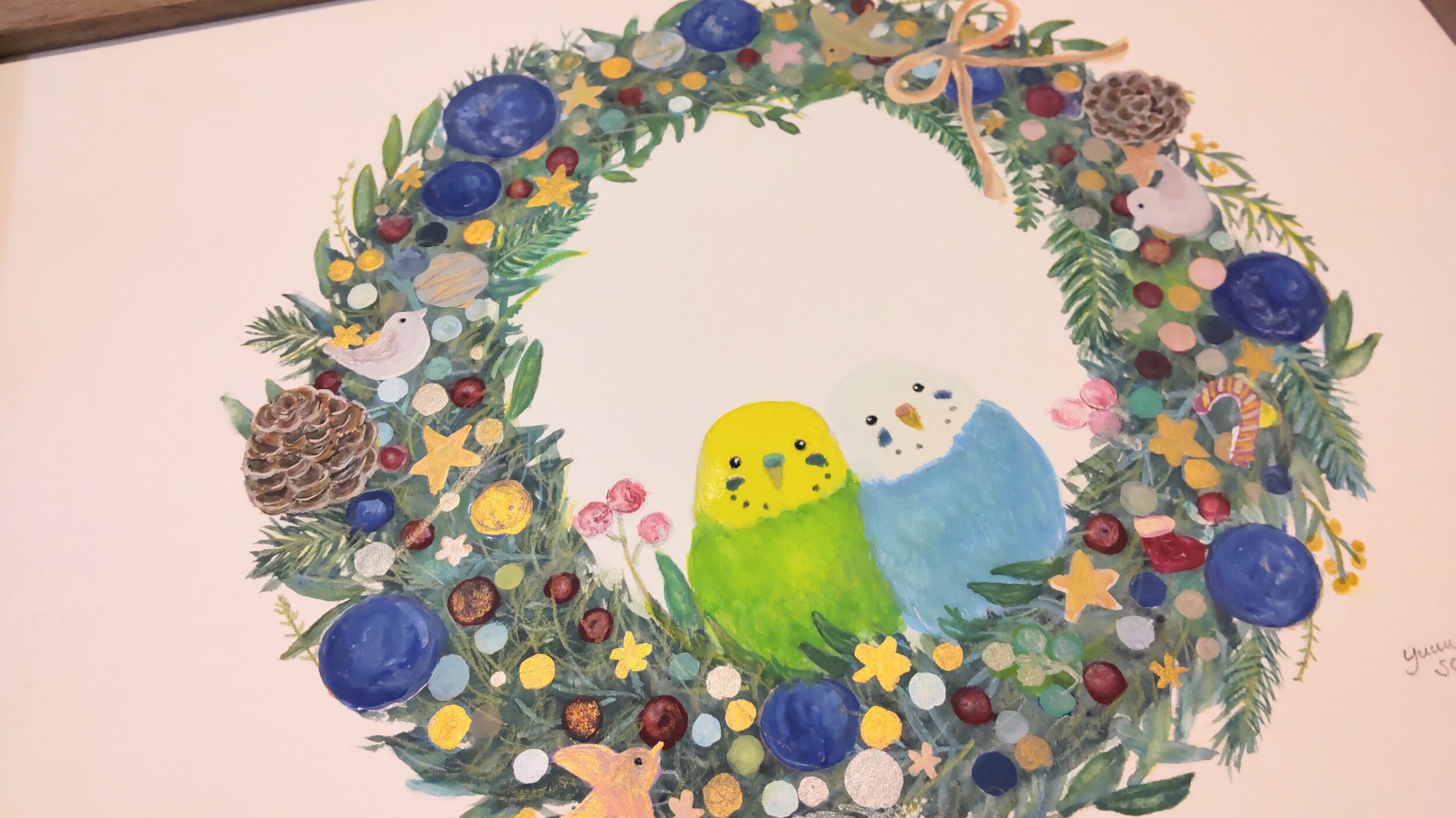 寄り添うセキセイインコ2羽とクリスマスリースを描きました。
