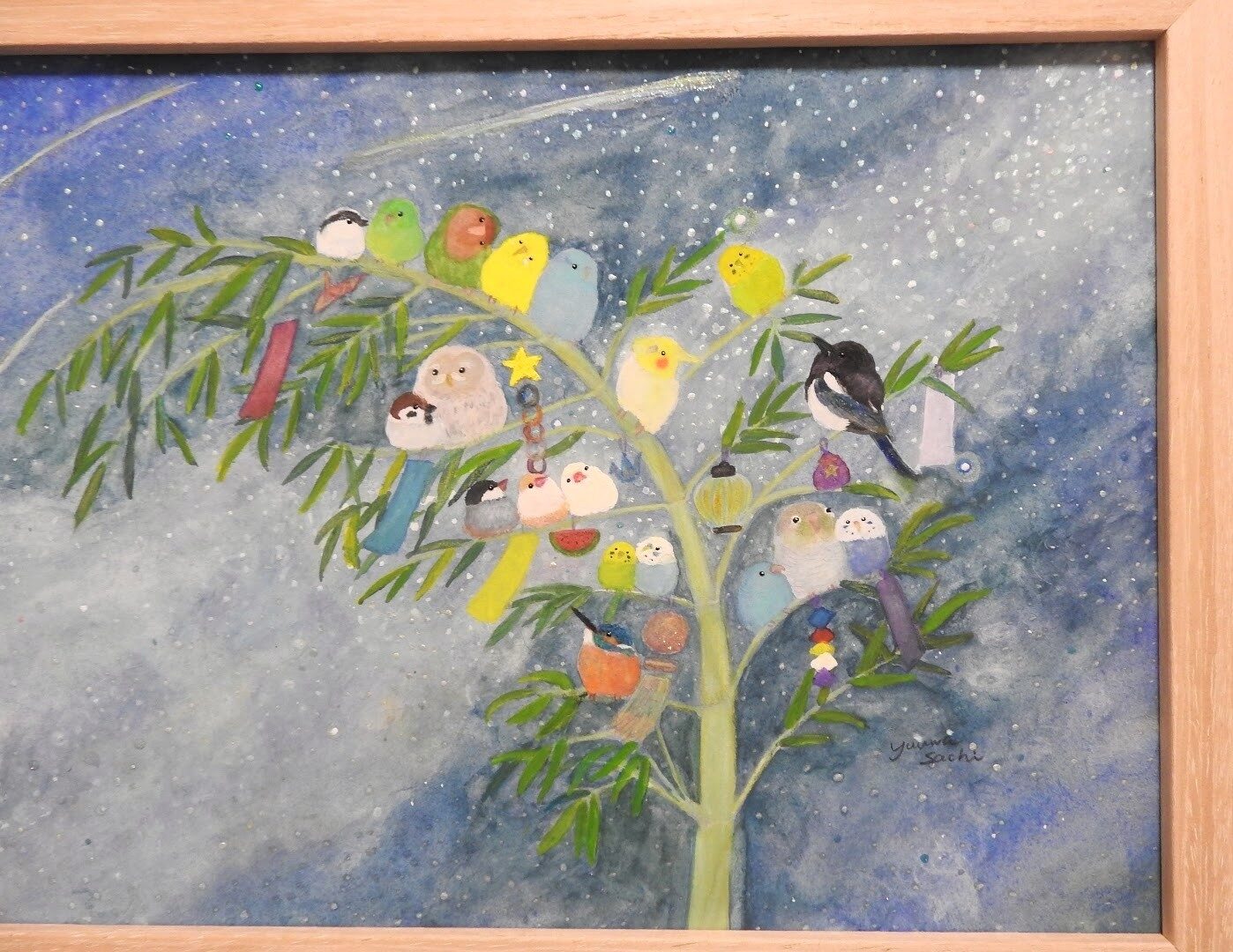 天の川、流れ星を笹の葉に揺られながら見上げる小鳥達を描いた幻想的な作品です。