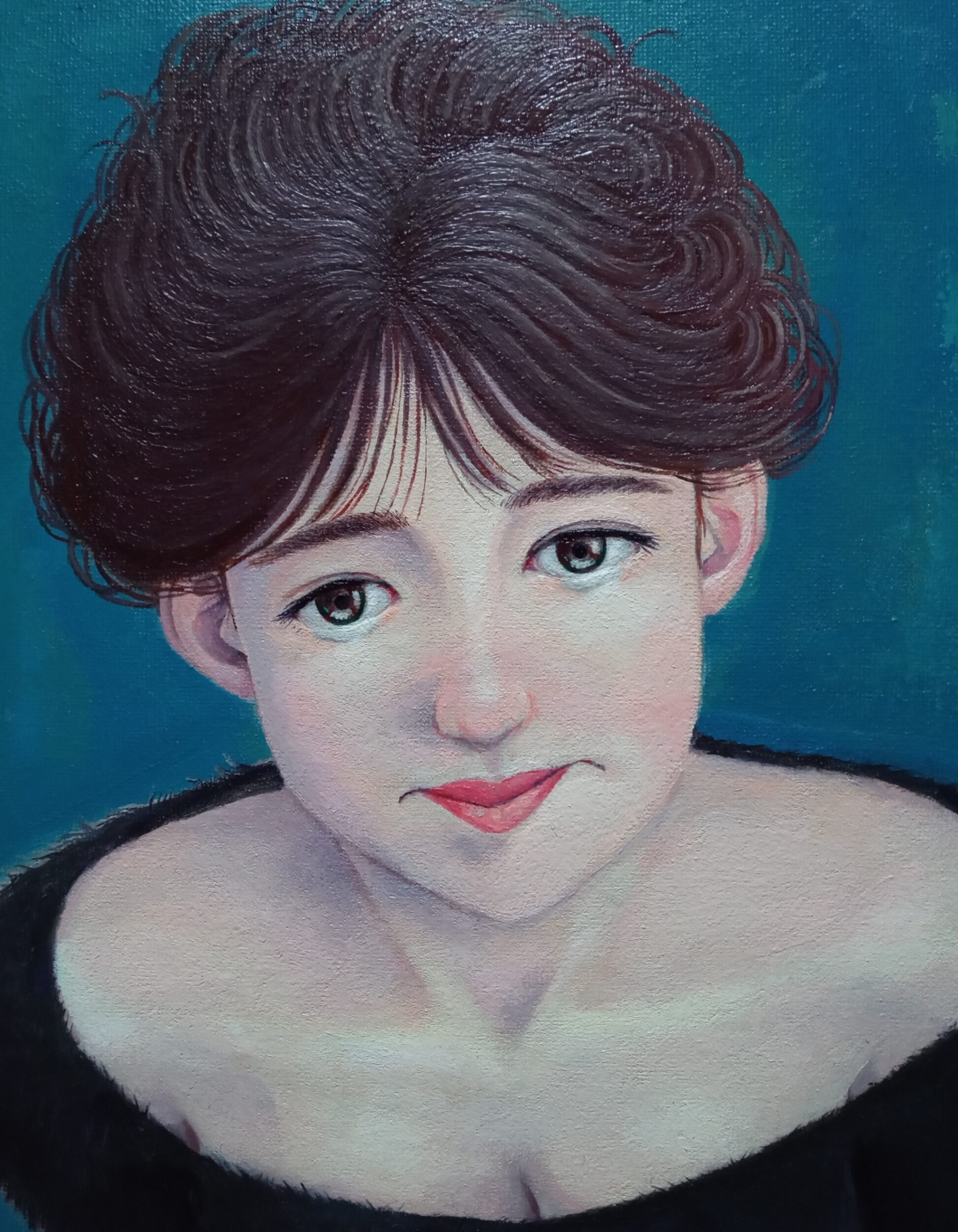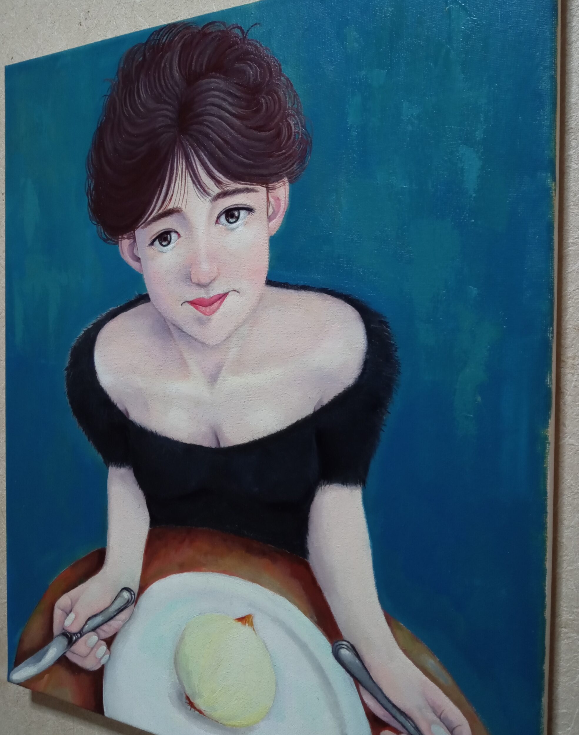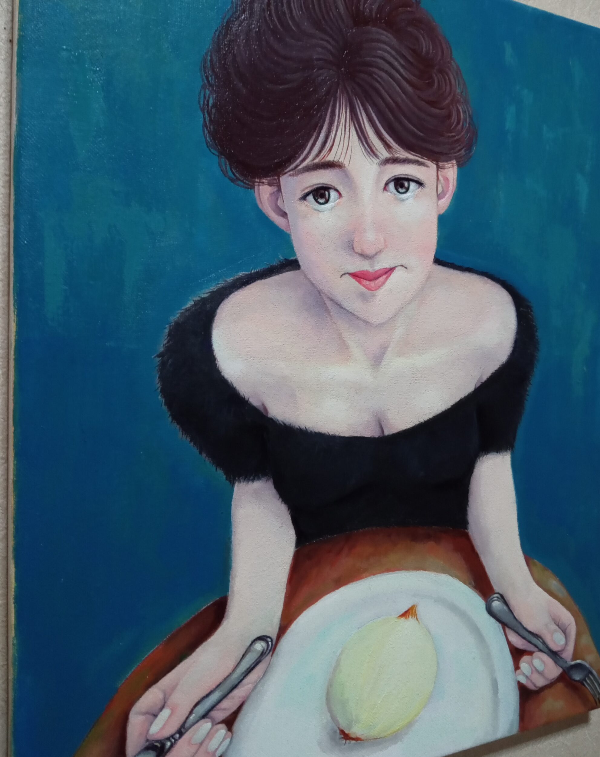 油彩画キャンバス F8号 series Women ㉖ 今を生きる女性をスパイスを効かせた愛で表現しました。 「泣いているのは玉ねぎのせいによ…」涙なんか玉ねぎのせいにして、また明日に向かって歩き出しましょう!