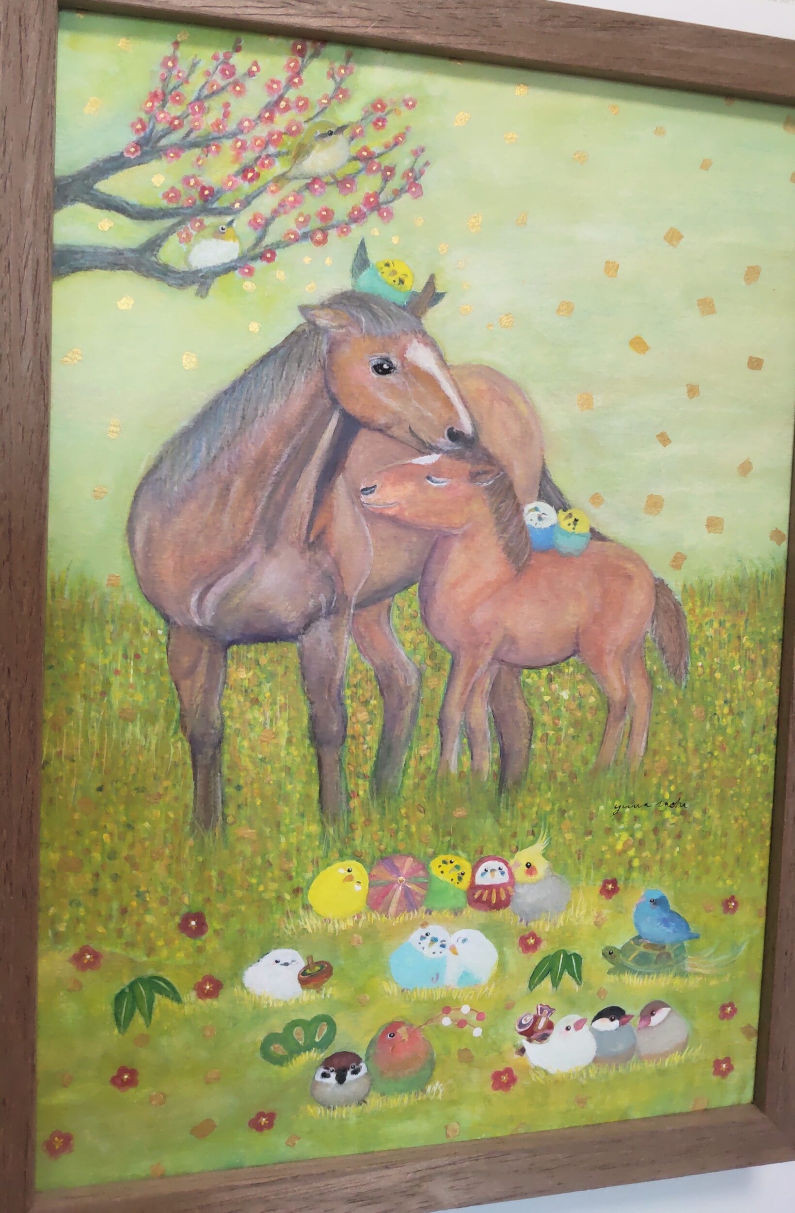 寄り添いあい、互いの幸せを願う気持ちを表現しました。馬の親子と小鳥たちを優しいタッチで描いた心なごむ一枚です。