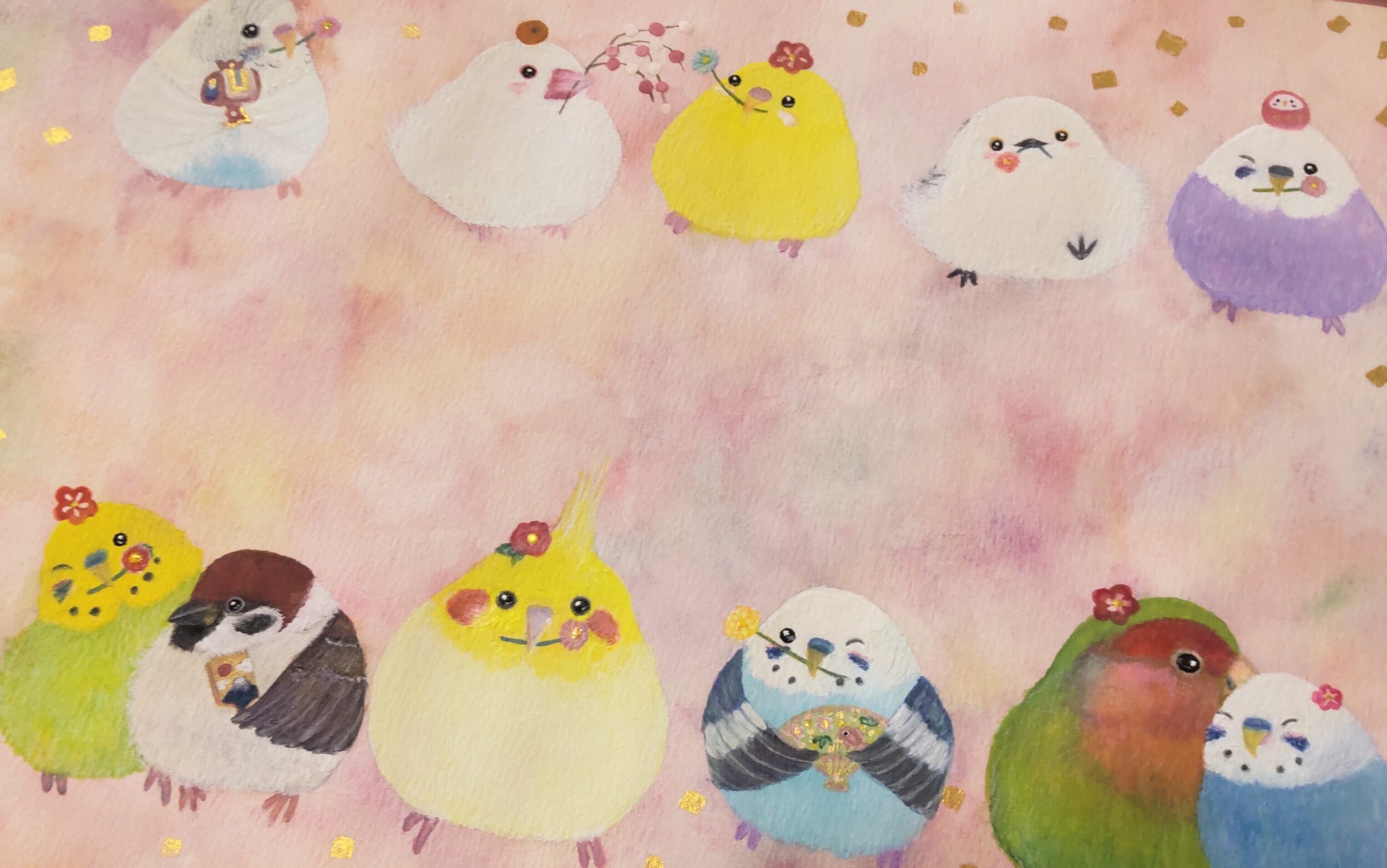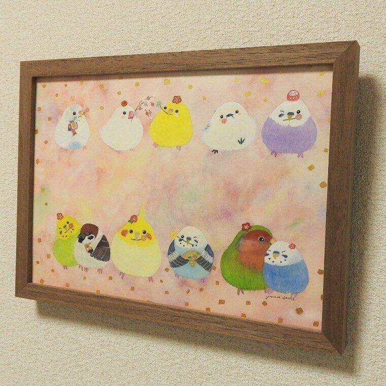 新たな年が幸せな一年になるよう、ふわふわの小鳥たちと縁起物を描いた心なごむ1枚です。