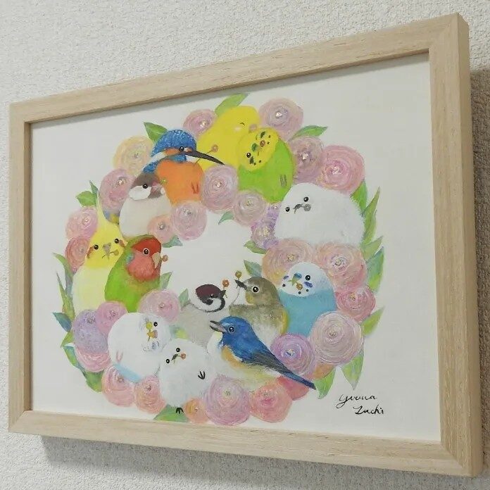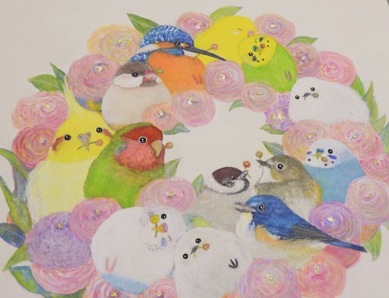 優しい色合いの小鳥たちとお花のリースを描きました。穏やかな気持ちになれる1枚です。