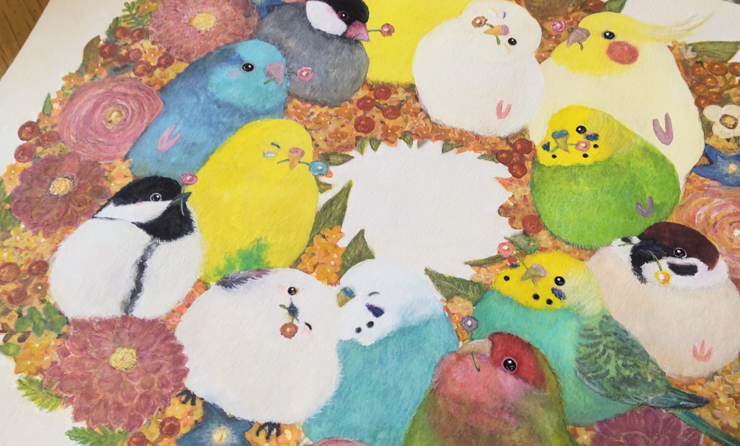あたたかな気持ちになるふわふわの小鳥たちとお花を描いたほっこりする1枚です。