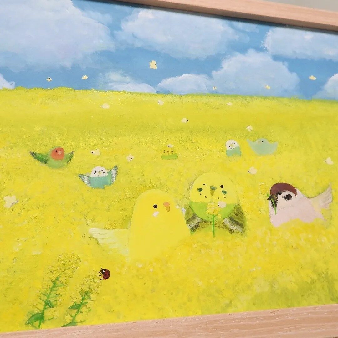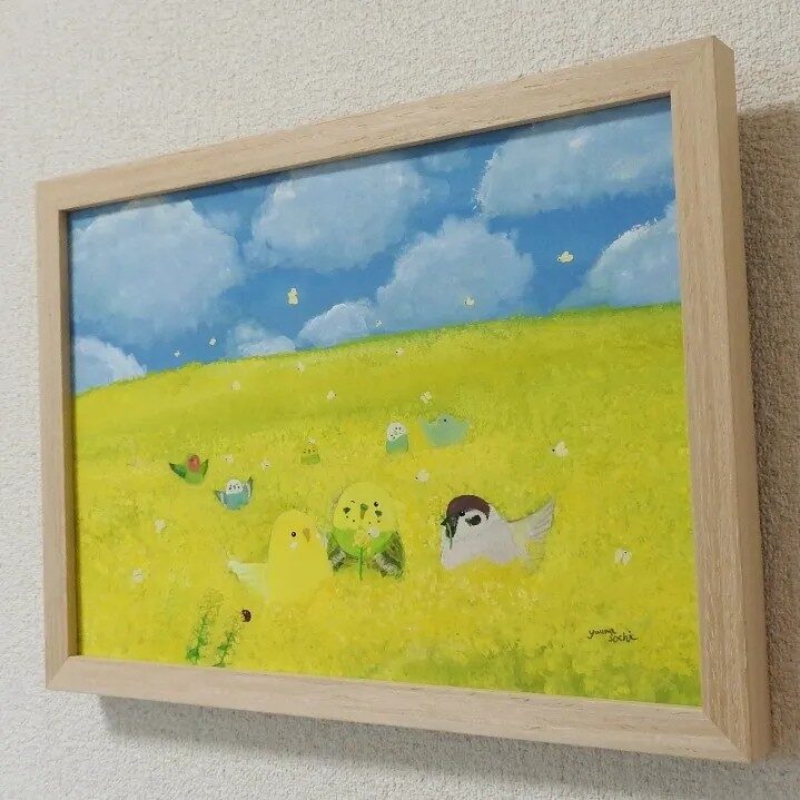 花畑と小鳥たちを描いたイエローが綺麗なインテリアアートとしてもおすすめの1点もの絵画です。