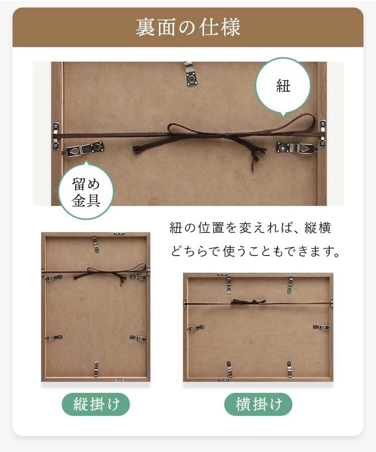 付属品の吊りヒモと裏面の吊り金具を使用して壁掛けでの使用が可能です。