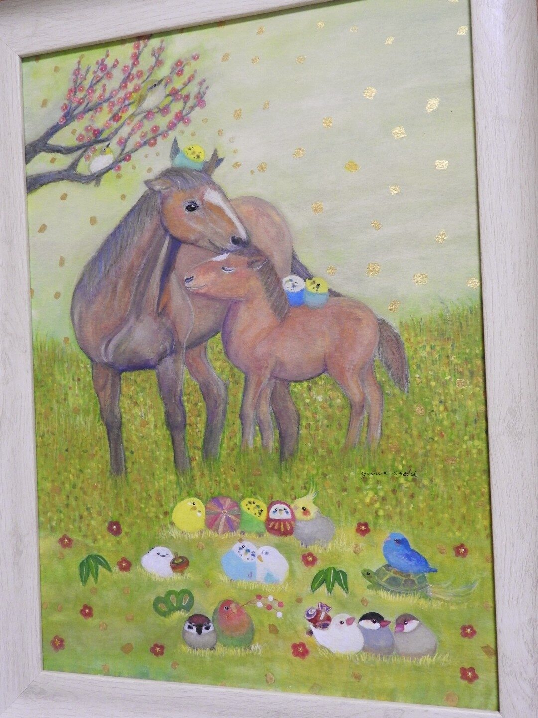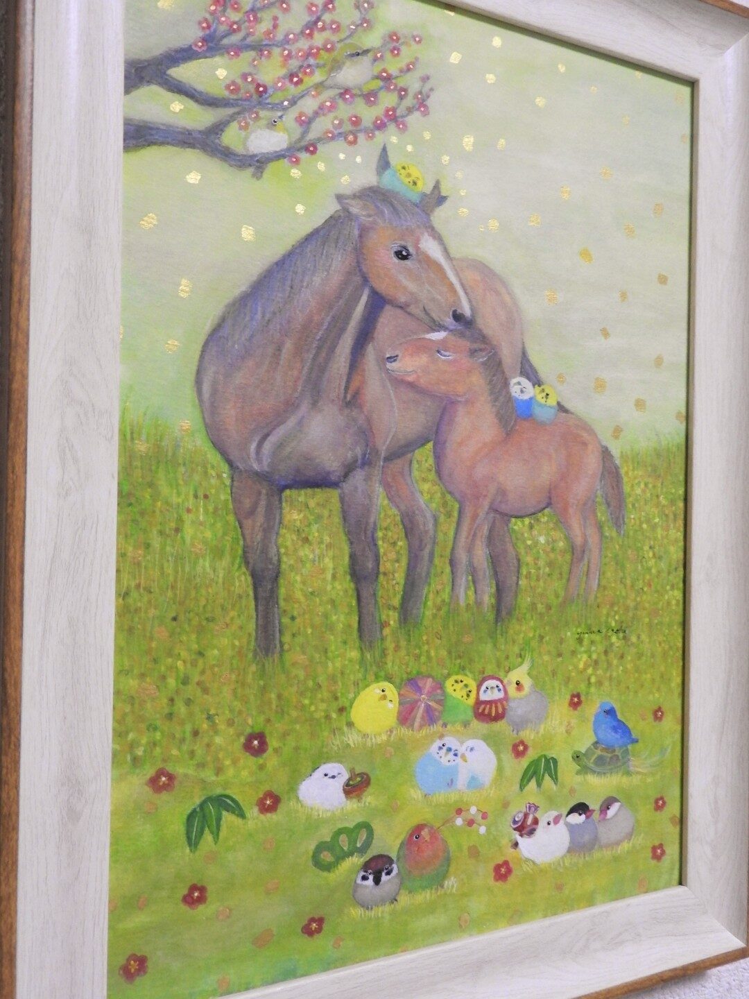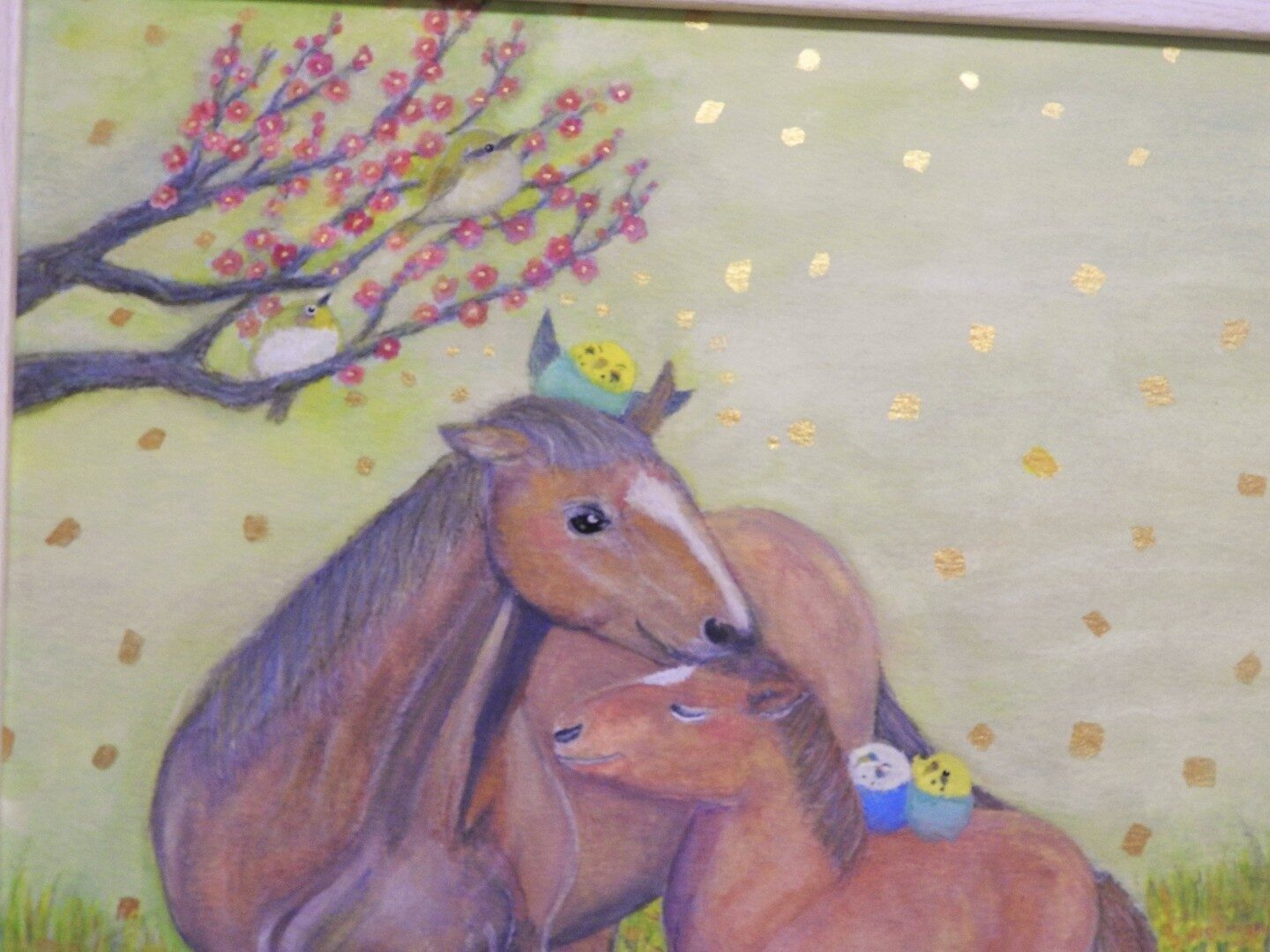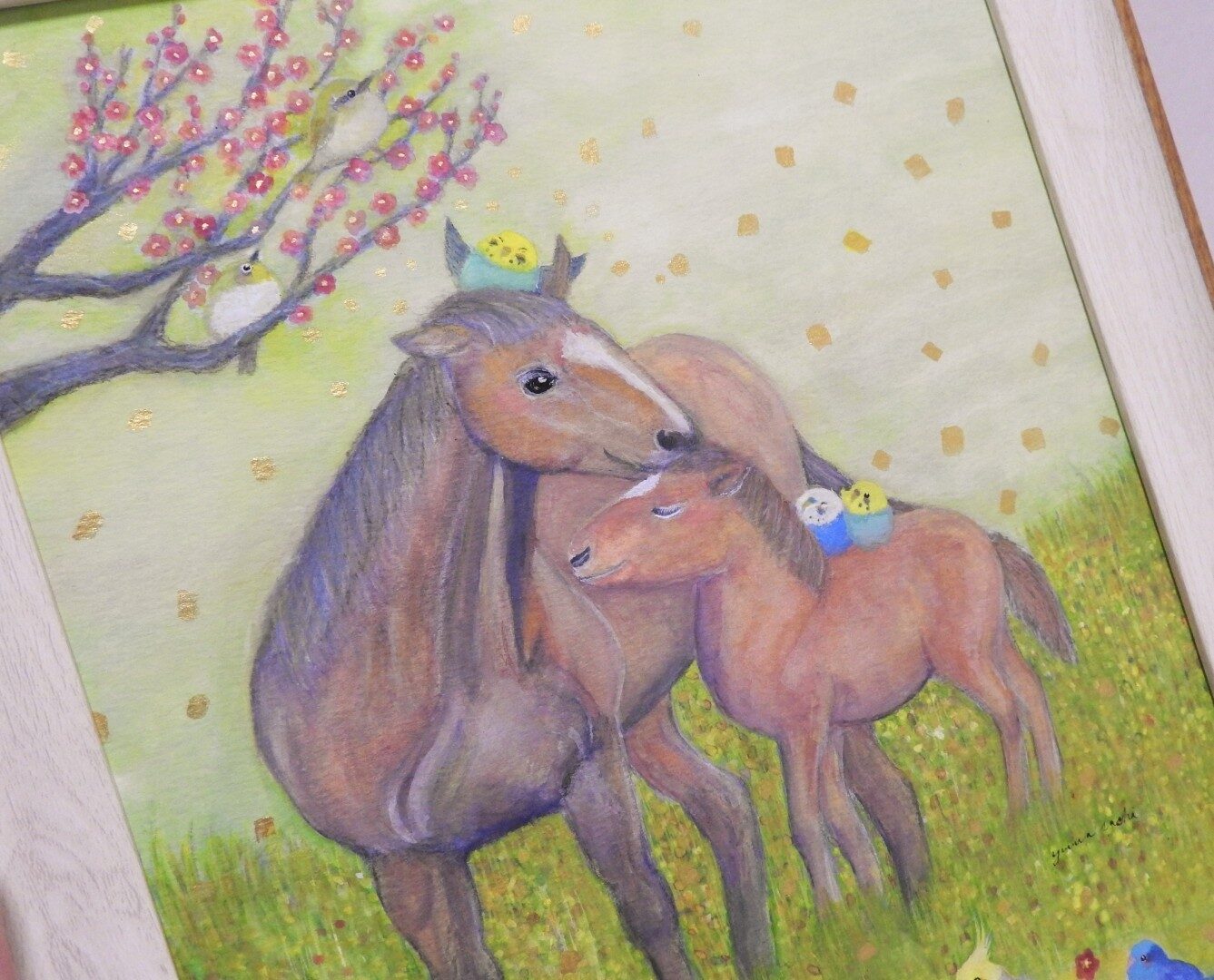 寄り添いあい、互いの幸せを願う気持ちを表現しました。馬の親子と小鳥たちを優しいタッチで描いた心なごむ一枚です。