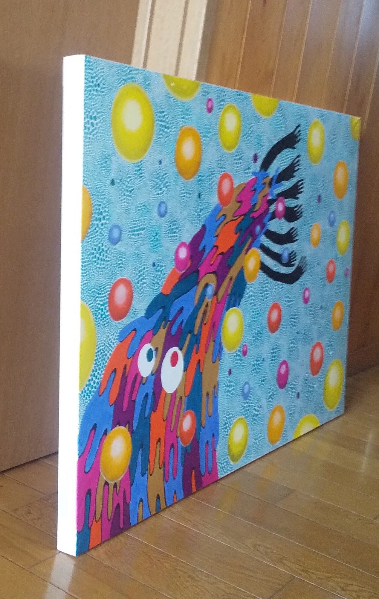 人々は困難が起きた時神様に助けを願うが私は無宗教の為助けを願う神様が居ない。居ないなら自分で作ろうと思い、自分の信じる世界を自分で作っている。そして地球上のあらゆる問題に心がつらくなる事が多くどうにかしてこの問題を解決出来ないかと考え問題を解決してくれる生物達を描くようになった。その為丸の世界には奇妙な生物達が沢山住んでいる。地球上の問題が増え続ければ丸の世界の奇妙な生物達も増え続けて行く。地球とは正反対の幸せな丸の世界と幸せな生物達がAnnの頭の中には常に存在している。この絵は木製パネルに画用紙を貼りアクリル絵の具を使って描いて描いて仕上げにクリスタルバーニッシュを塗りほこりや有害ガスから作品を保護している。
