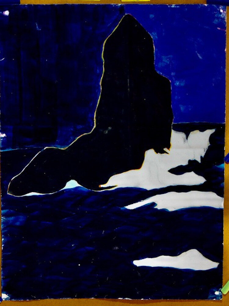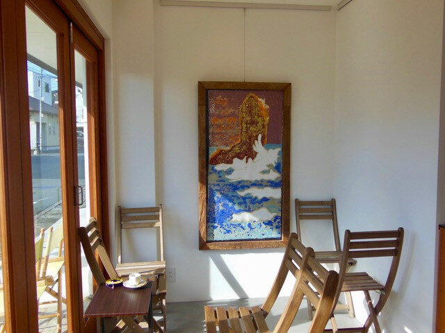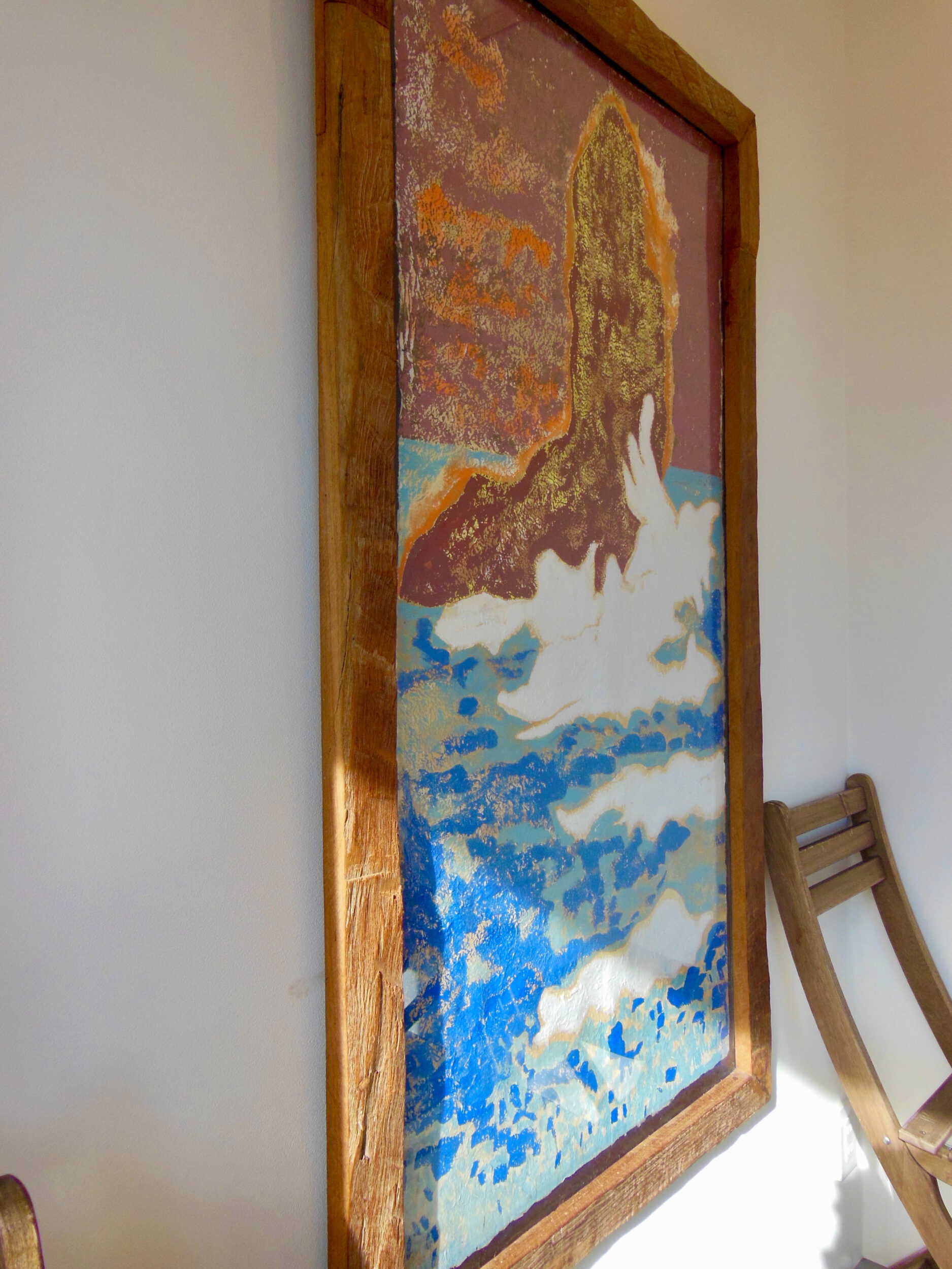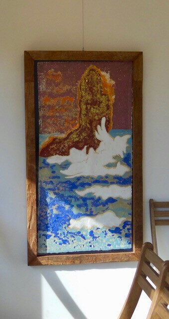 下田市 舞磯浜の日の出前に古代を感じ、まだ酸素も二酸化炭素の割合も生命体が存在し難い空気感をイメージ、裸眼で見える色とは違う選択をし、群青色は30分程焼を入れ、鮮やかさをトーン ダウン、スケッチは京都顔彩で写実的に描き、大下図は群青色と濃い藍色で抽象化、制作に半年間を要した力作です、フレームは古いチーク材、シールドはアクリルでオートクチュール。