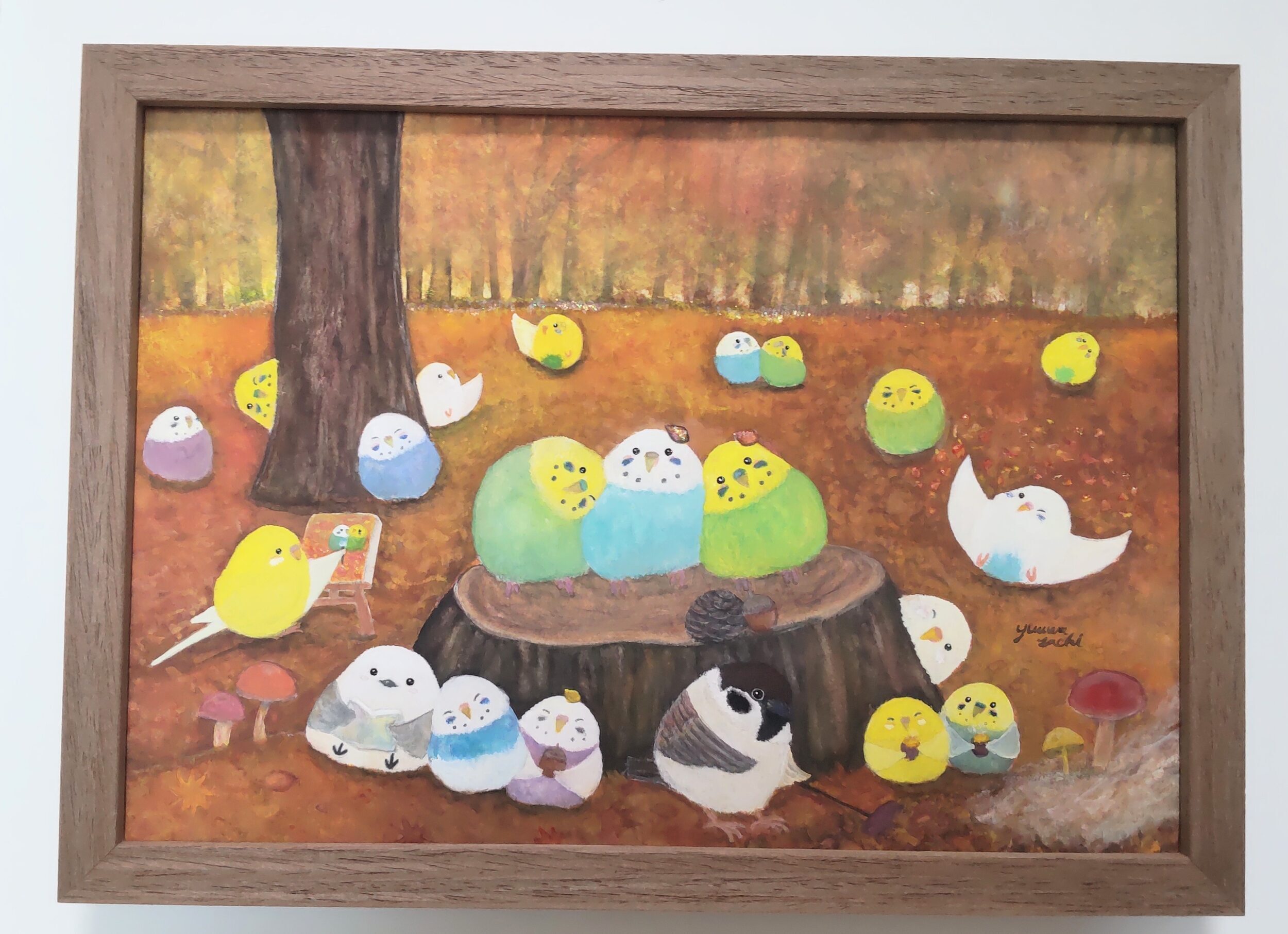 額入り原画A4『思い出の瞬間』 鳥 セキセイインコ シマエナガ スズメ 花火 夏 野鳥 文鳥