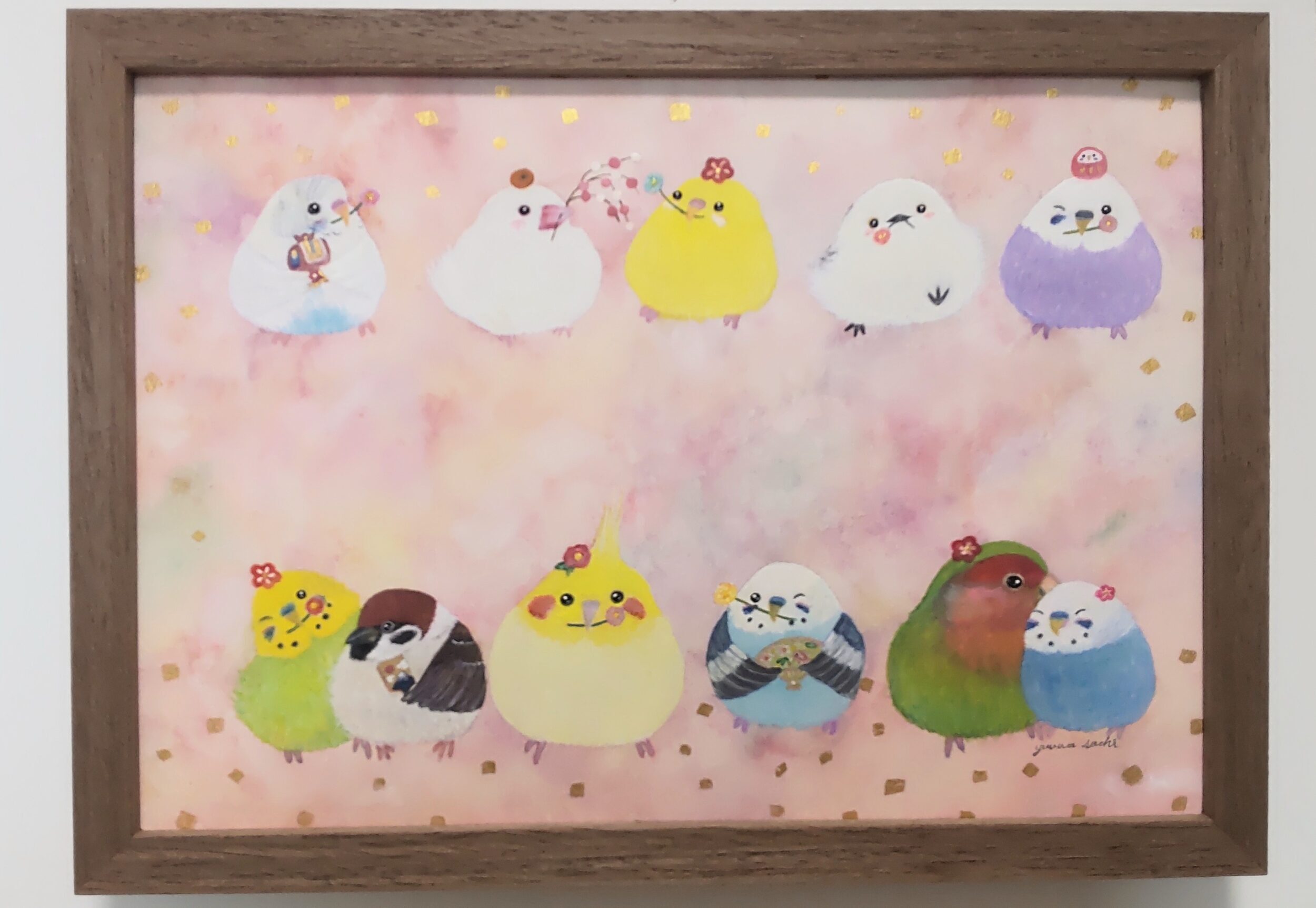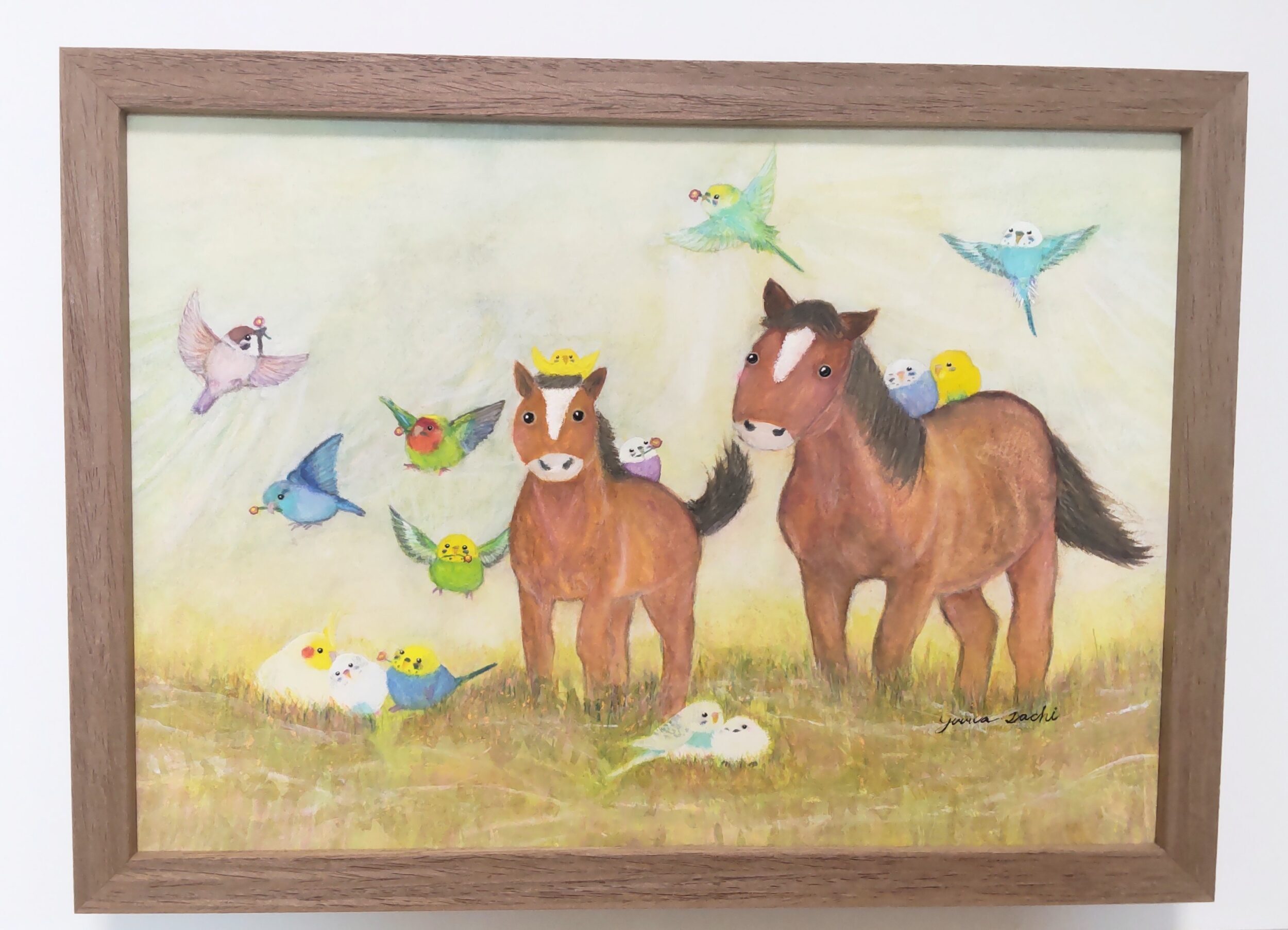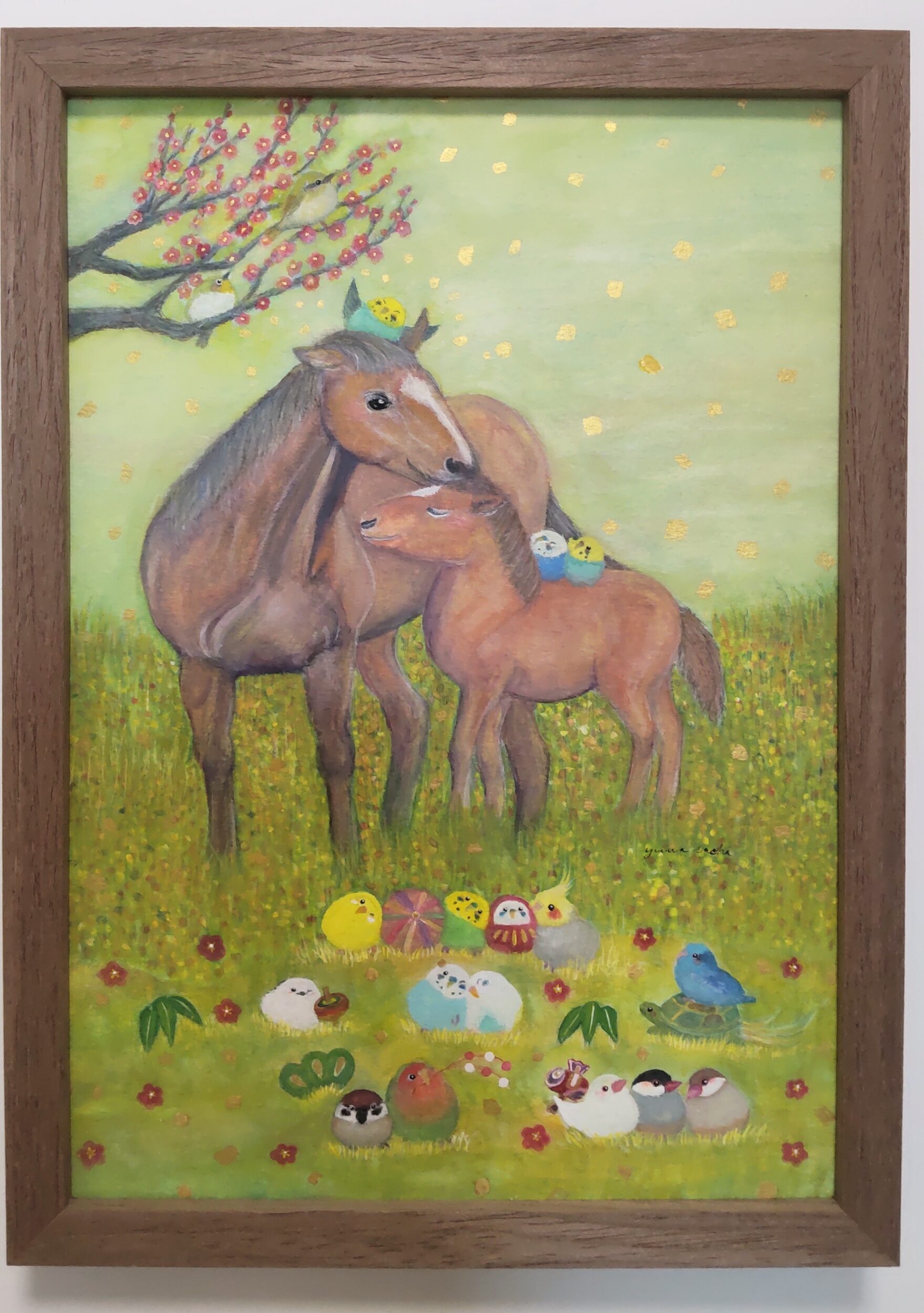 木製額入り原画A4『融和』 鳥 セキセイインコ シマエナガ スズメ 野鳥 馬 午年 正月