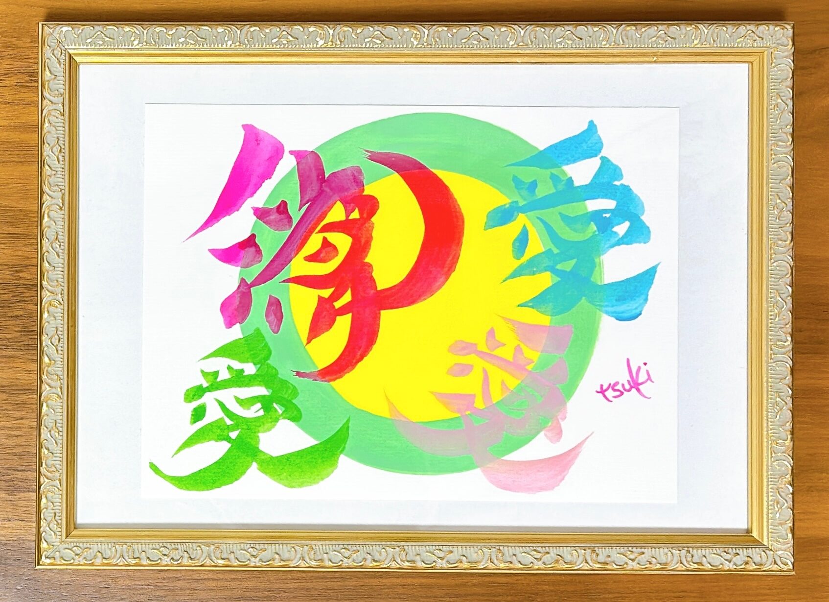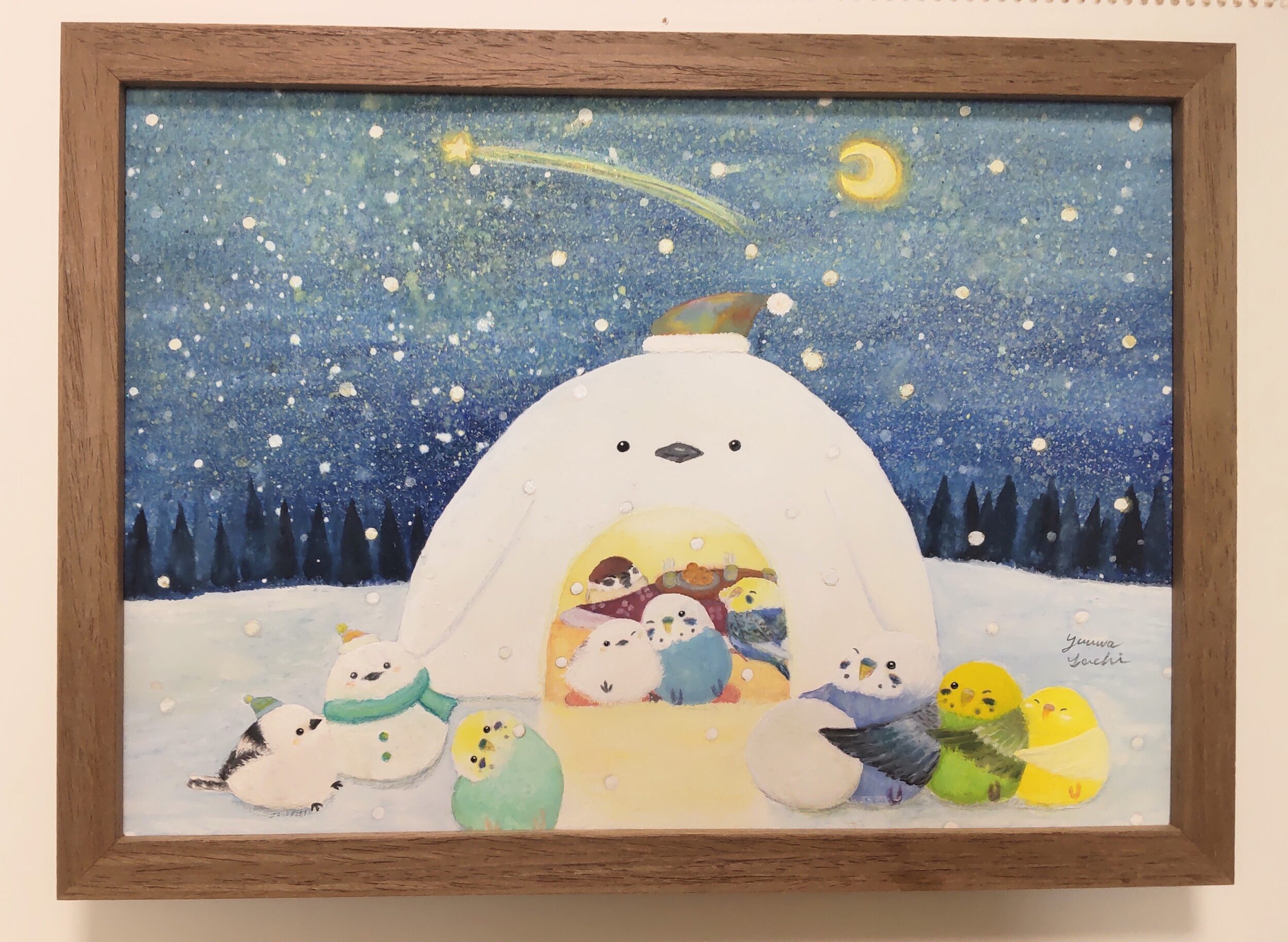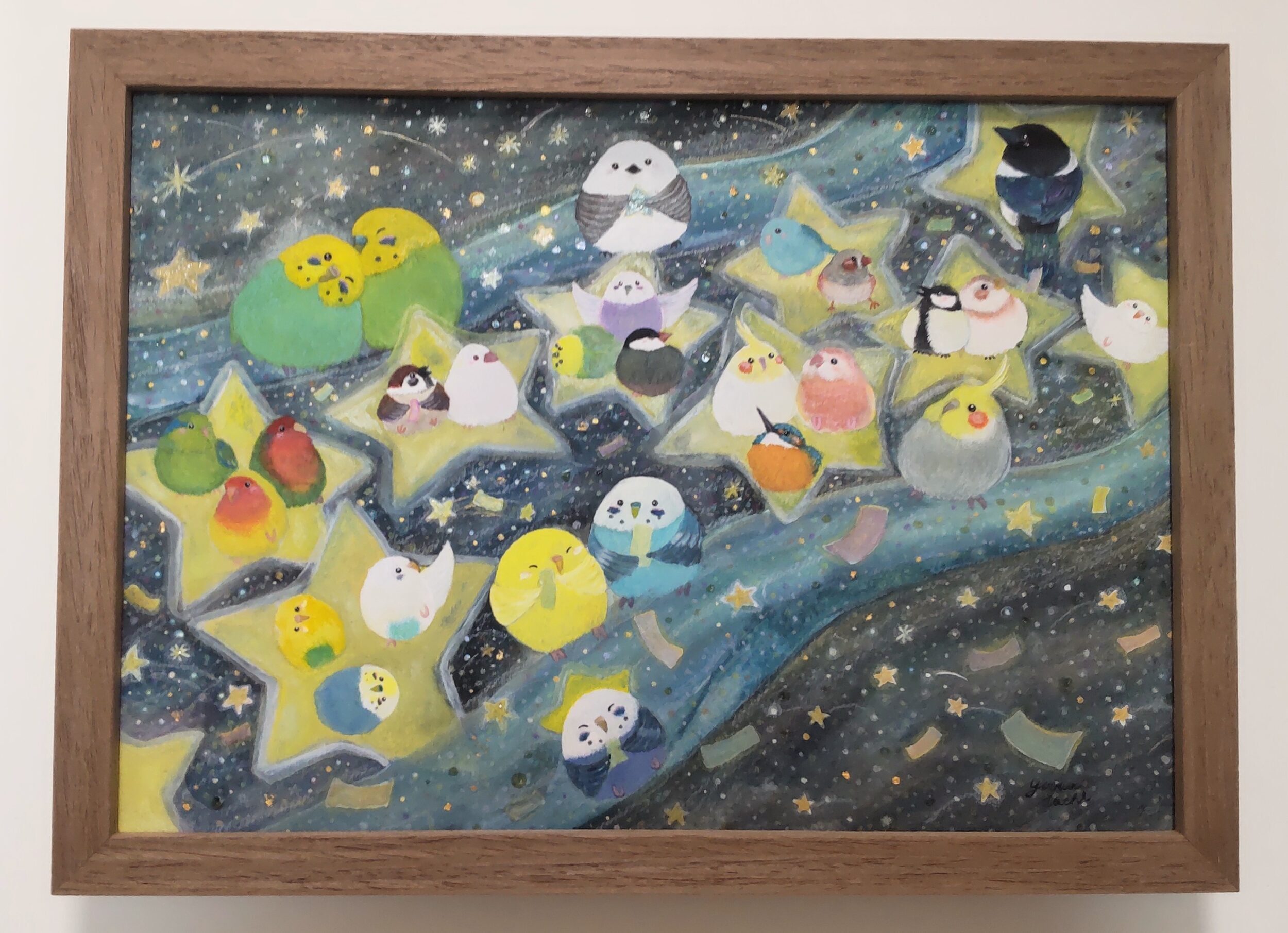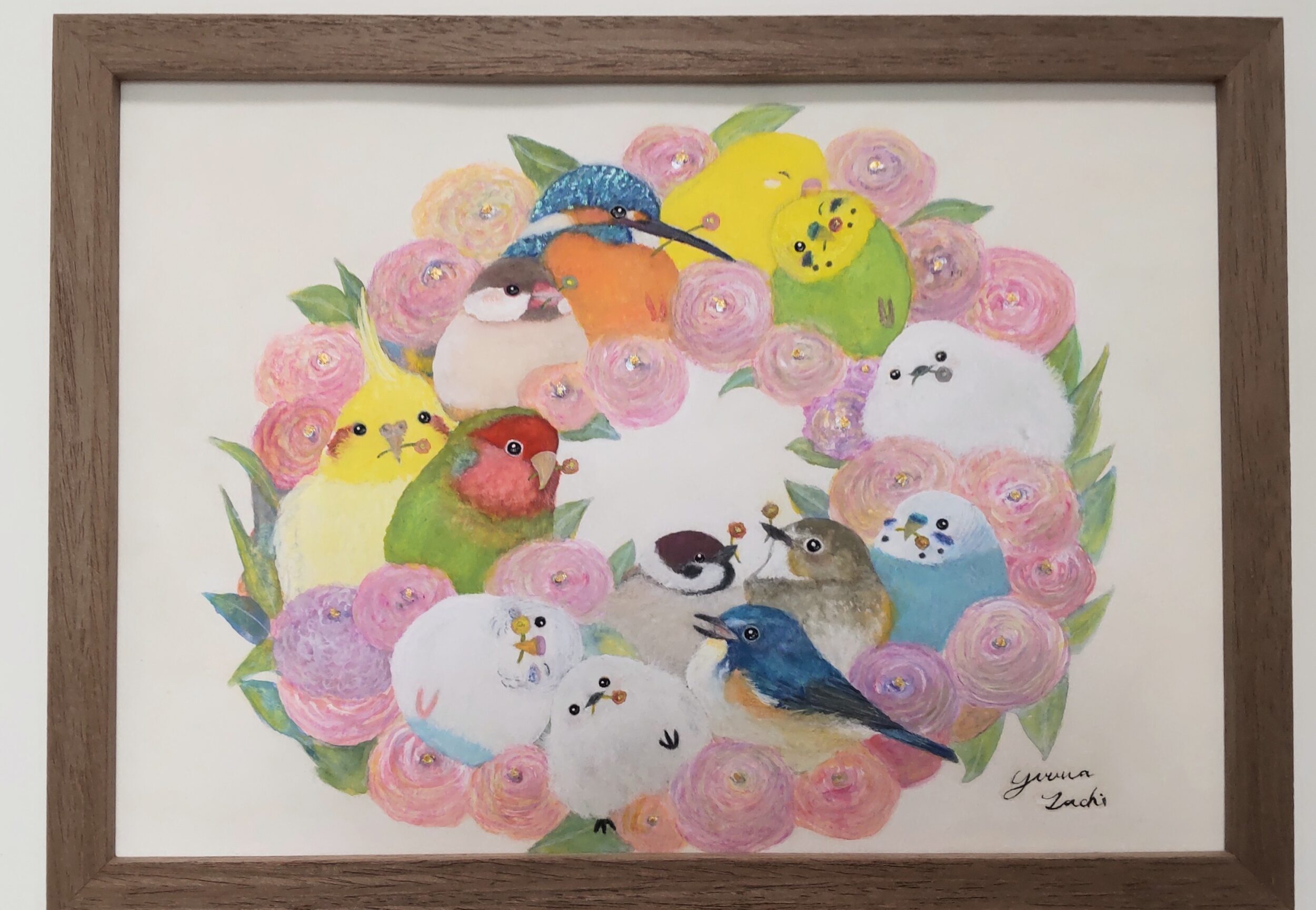 木製額入り原画A4『融和』 鳥 セキセイインコ シマエナガ スズメ 野鳥 馬 午年 正月