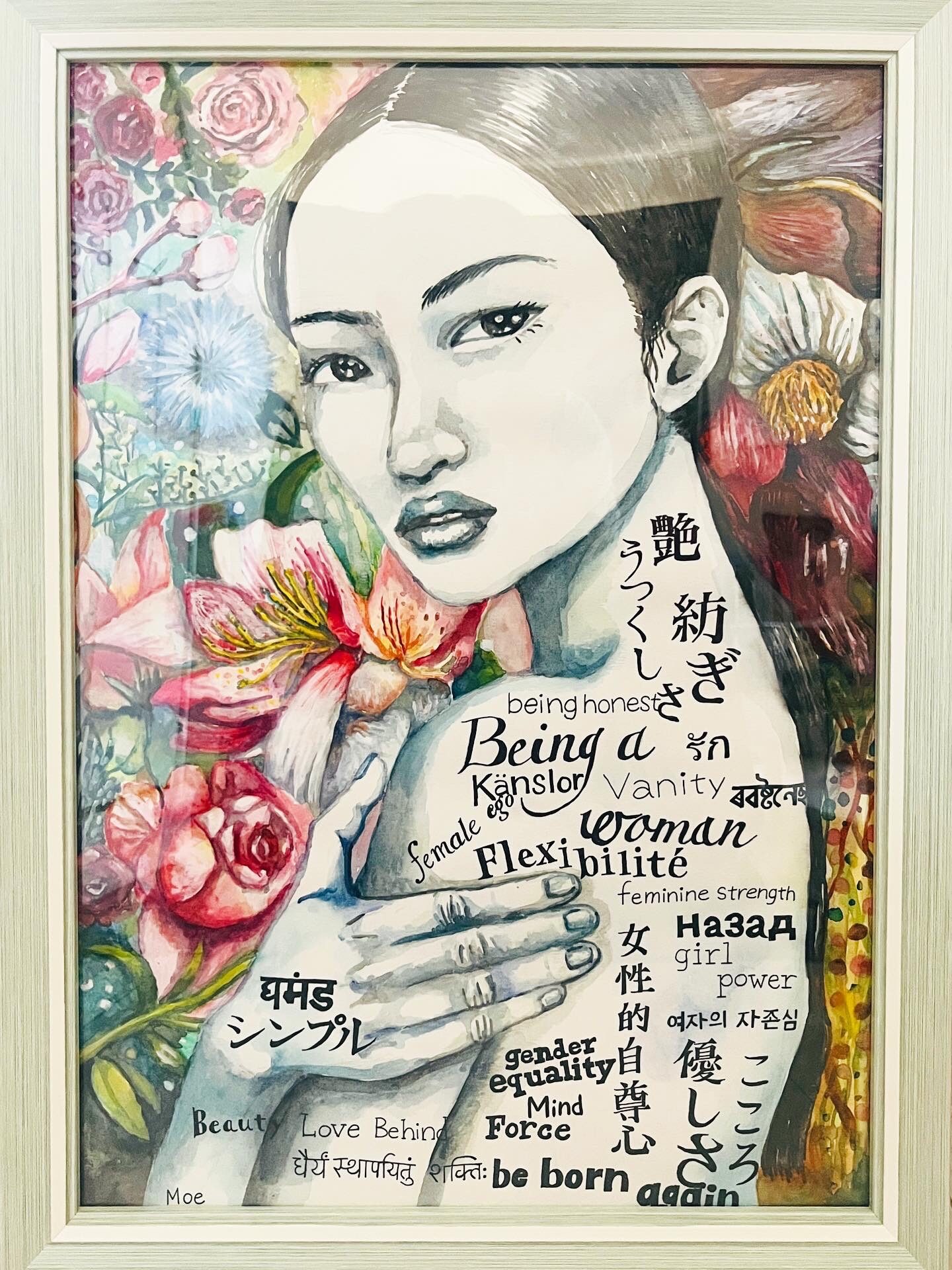 木製額入り原画A4『融和』 鳥 セキセイインコ シマエナガ スズメ 野鳥 馬 午年 正月
