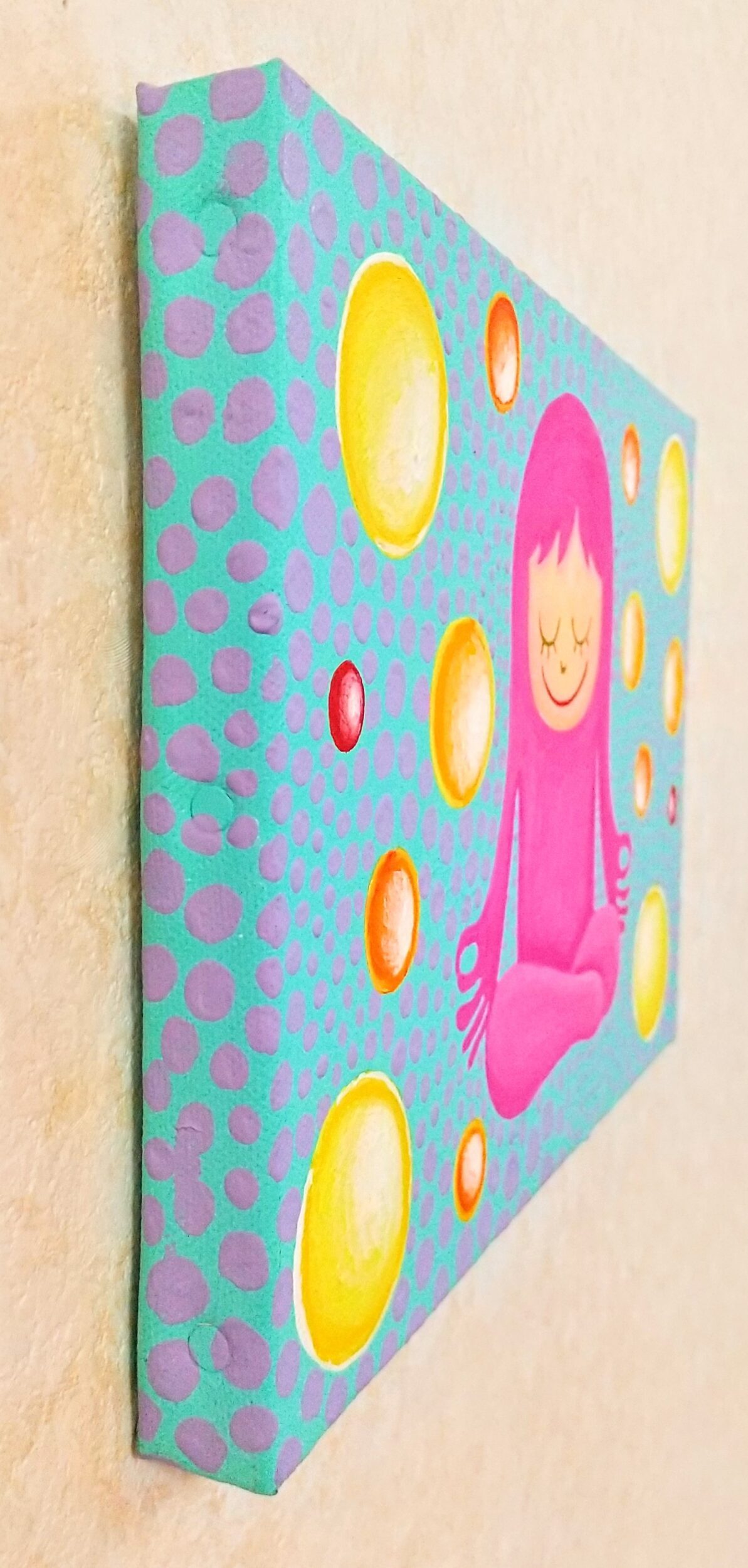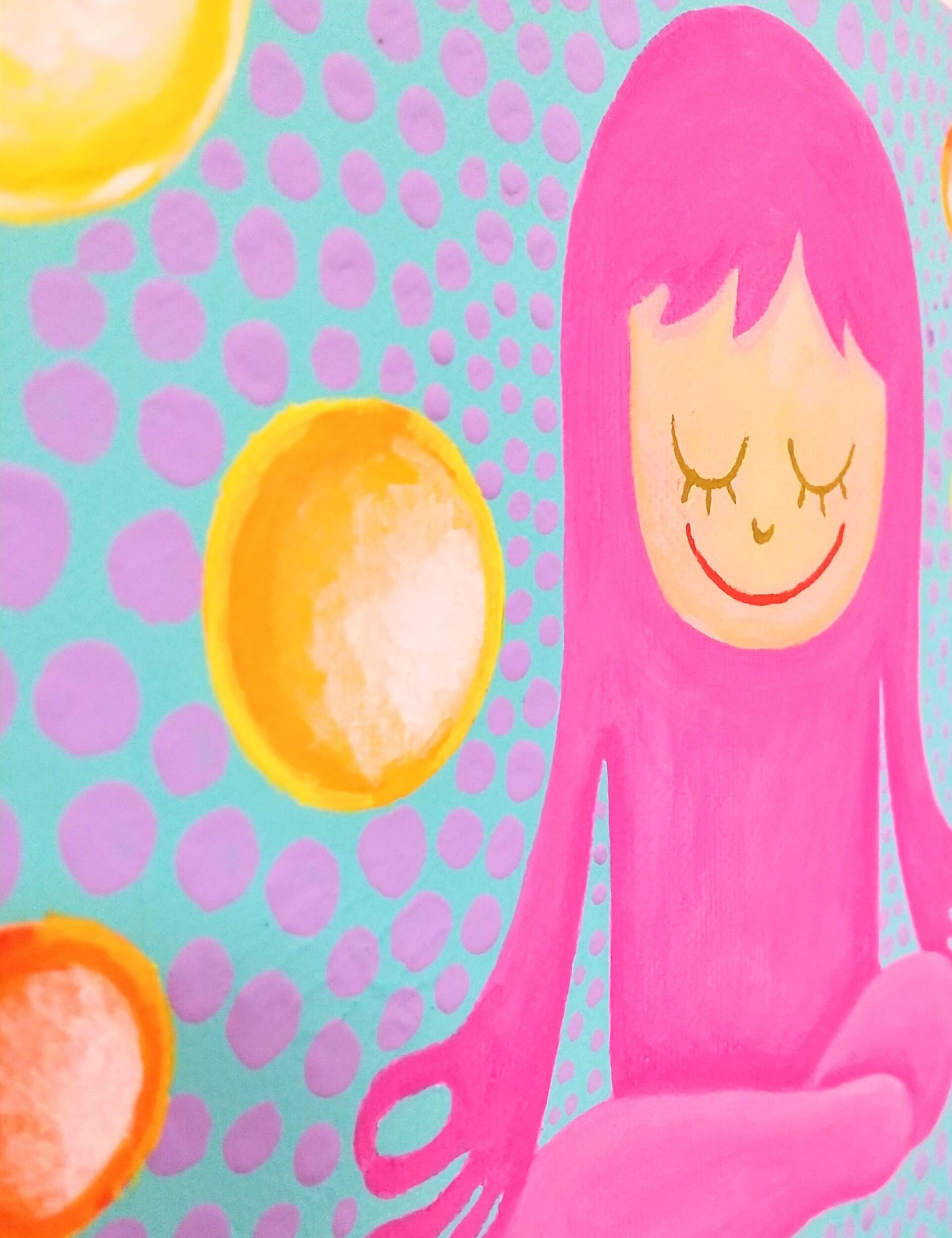 銀河系から遥か彼方に存在する架空の惑星、丸の世界に住んでいるマルちゃん。マルちゃんは丸の世界の生物達と地球上の生物達の幸せと平和を常に願っている。この作品はキャンバスにアクリル絵の具で描いている。キャンバス背部には紐を掛けられる金具付き。
