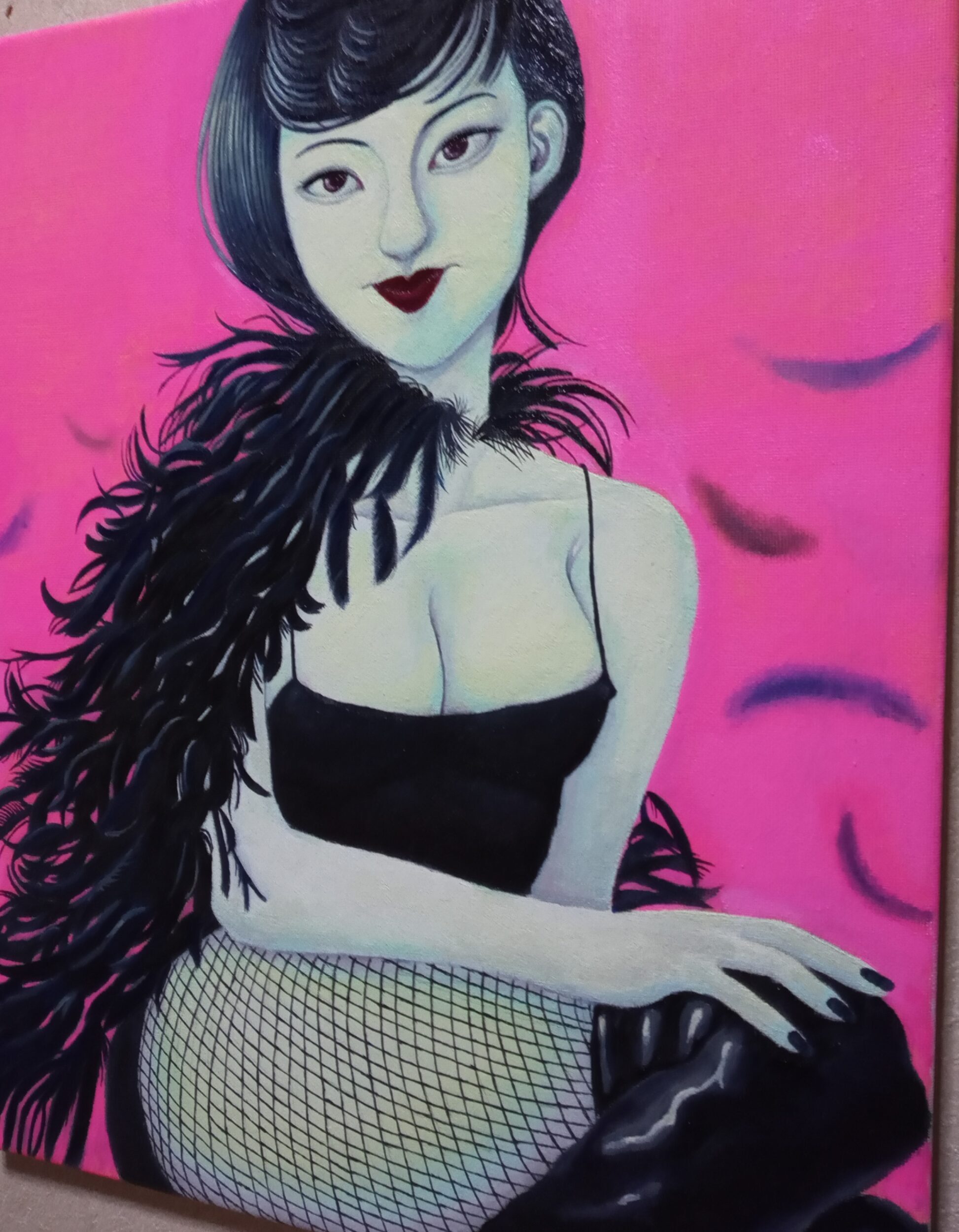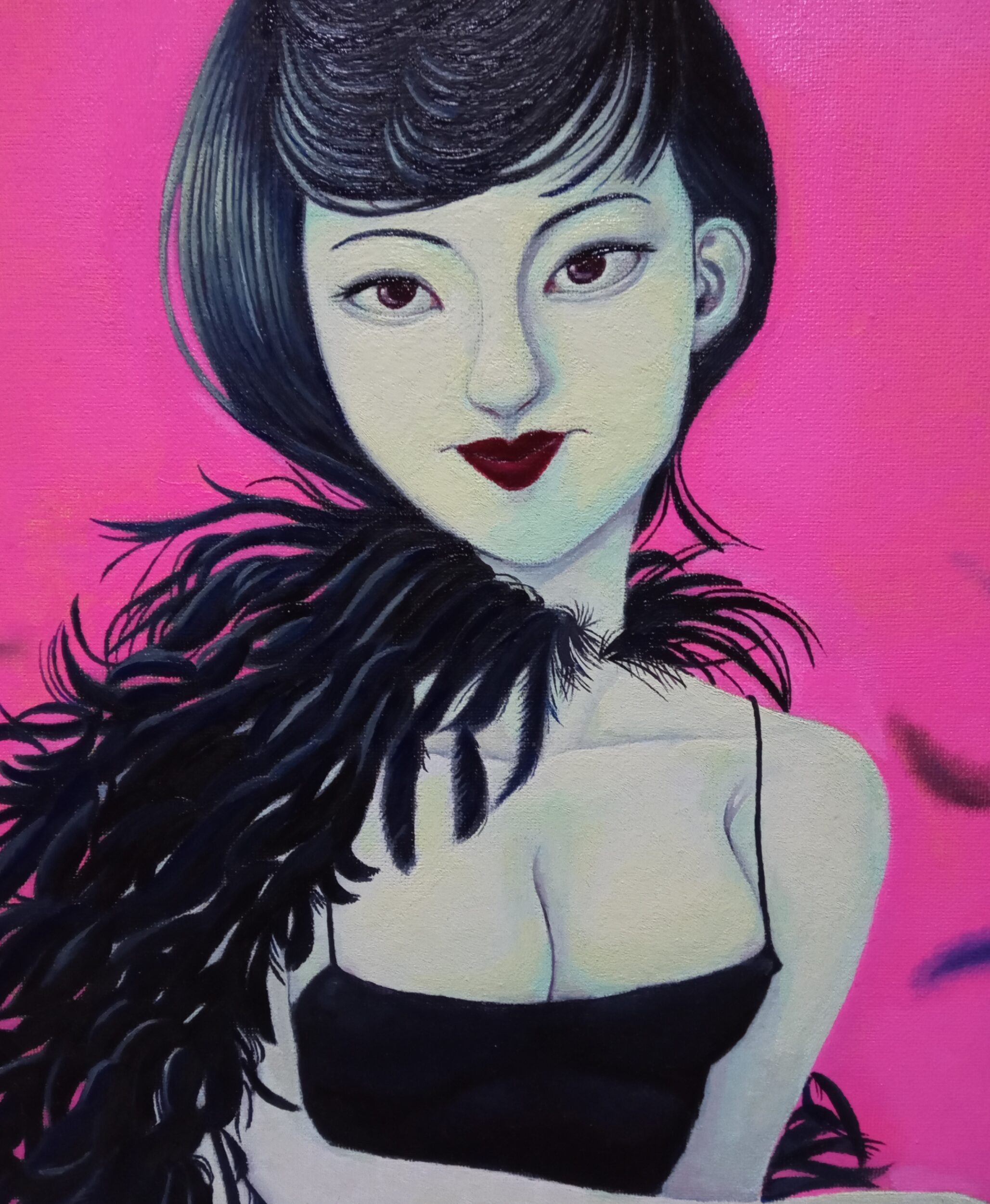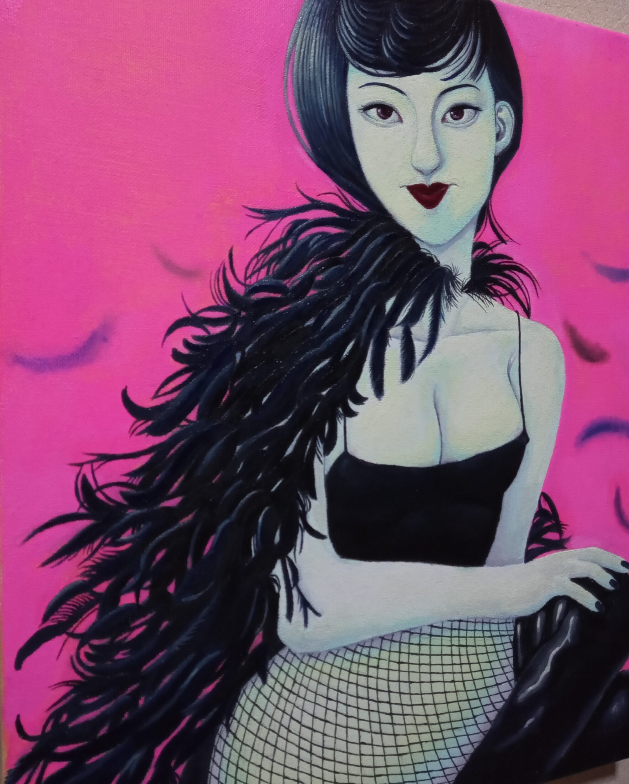 油彩画キャンバス F8号 series Monster&Fairy⑲ 伝説の妖怪や怪物、妖精などを現代風にアレンジして表現しました。 髪は烏の濡れ羽色、カラス娘のカー子ちゃん。自慢の御髪のお手入れも整い、何処かへお出かけでしょうか?