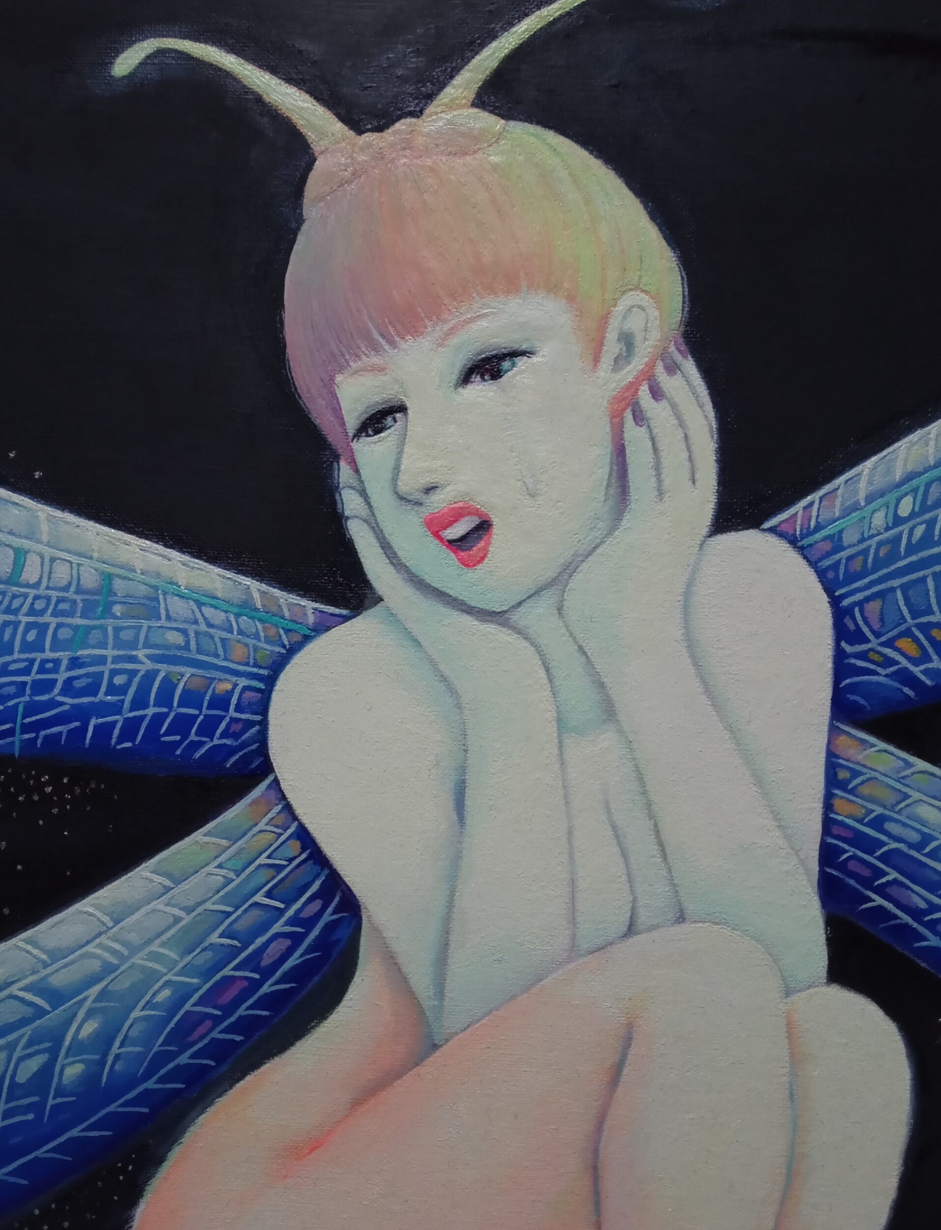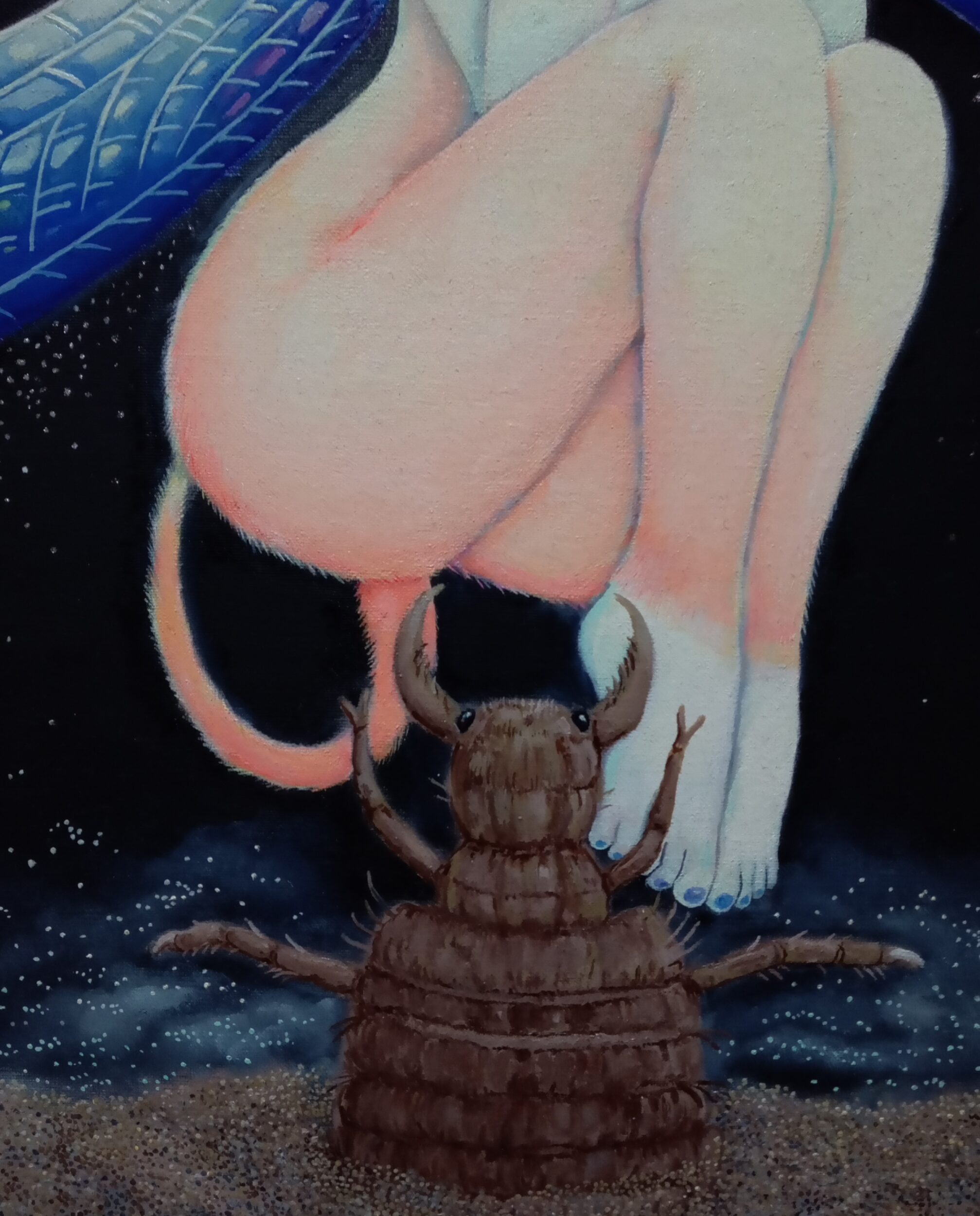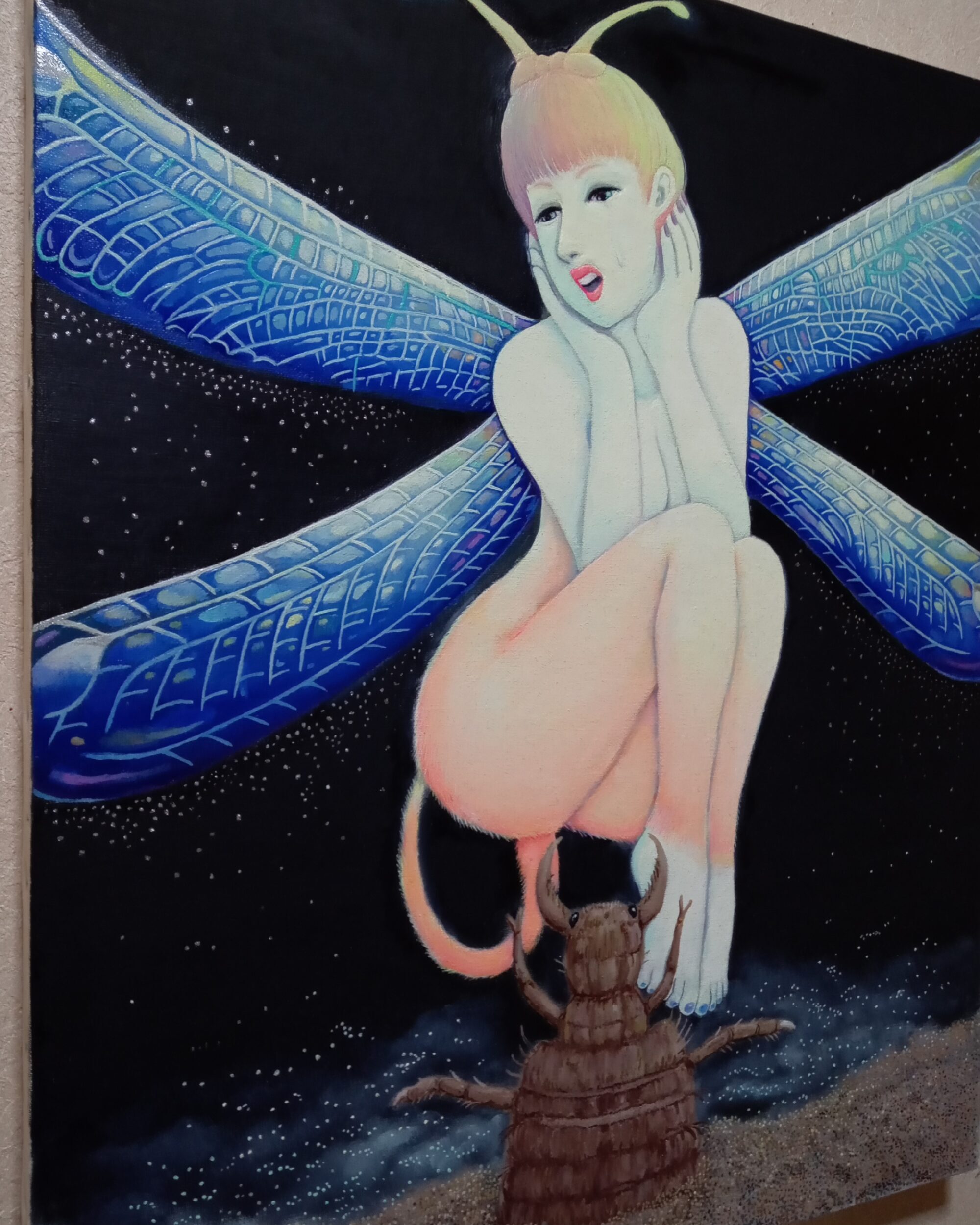 油彩画キャンバス F12号 series Monster&Fairy⑯ 伝説の妖怪や怪物、妖精などを現代風にアレンジして表現しました。 わずか2~3日の儚い命のウスバカゲロウちゃん 後ろ髪を引かれつつも、愛する我が子アリジゴク君を残し今旅立ってゆきます。「強くたくましく生きていってね…」