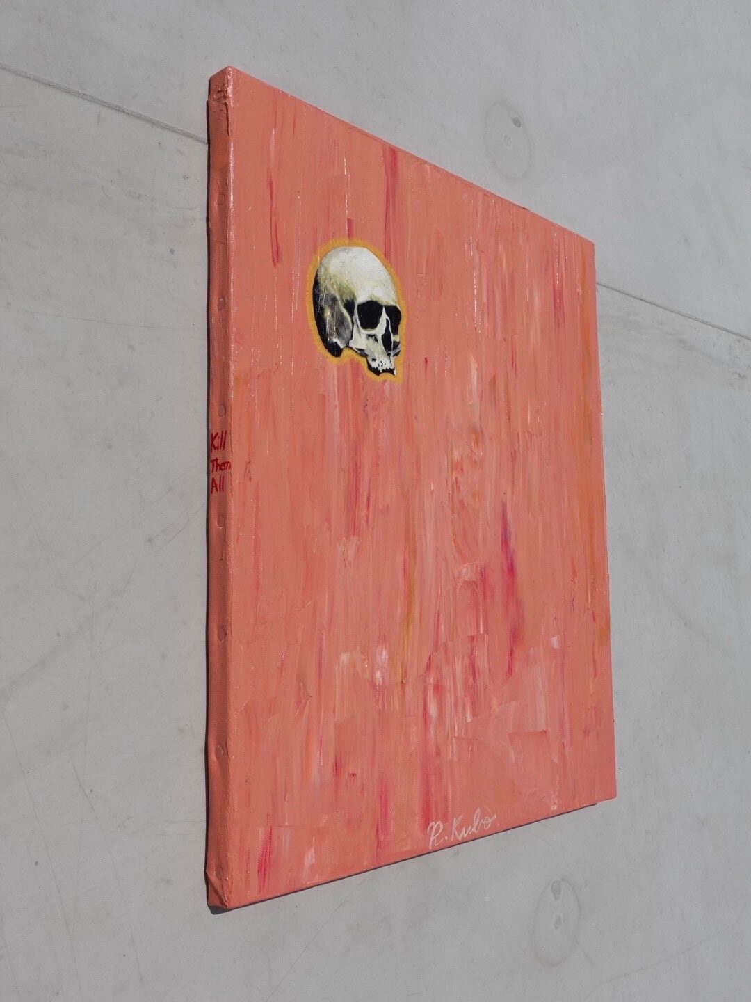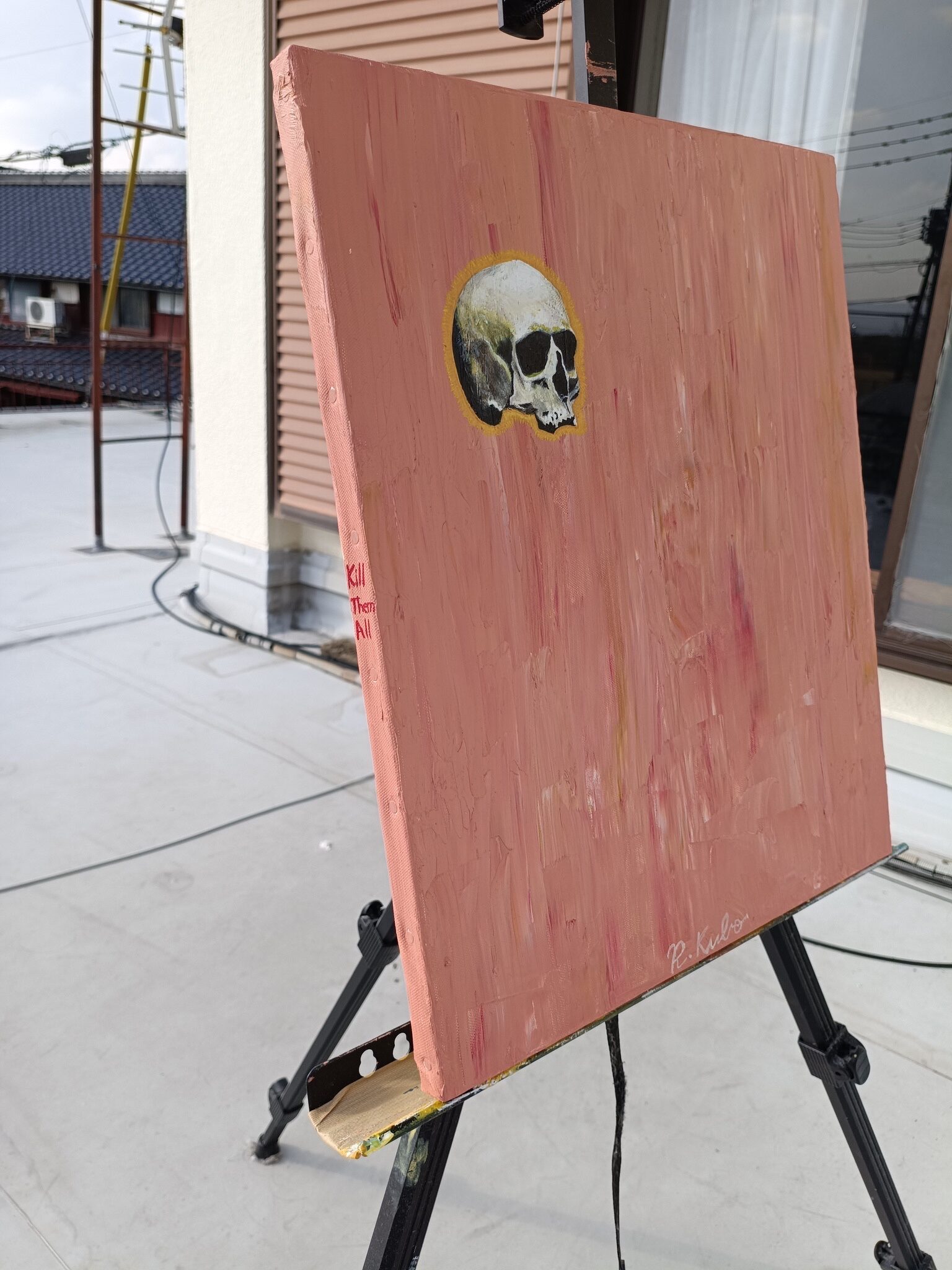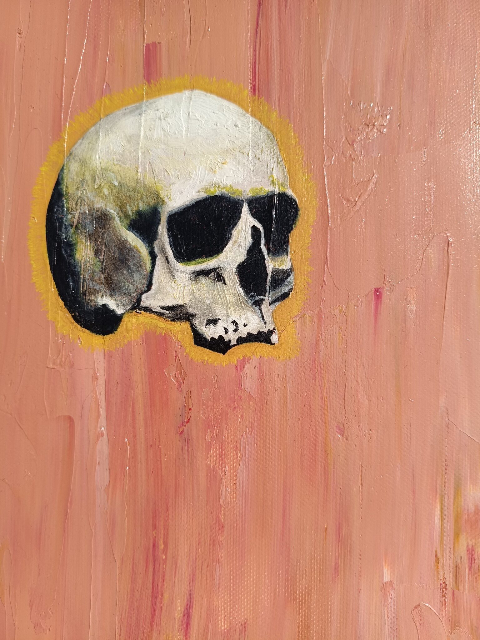 この作品を作成するにつれ、私は象徴と表現主義の影響の融合に没頭しました。落ち着いたピンクと厳しい縦の筆致は、頭蓋骨の厳しさとは対照的に、人生の変動するリズムを呼び起こします。それは情熱的な印象を与えます。この並置は、生と死の美しさと必然性を象徴し、内省を促します。私はまた、人間の精神と身体の感覚を得る。