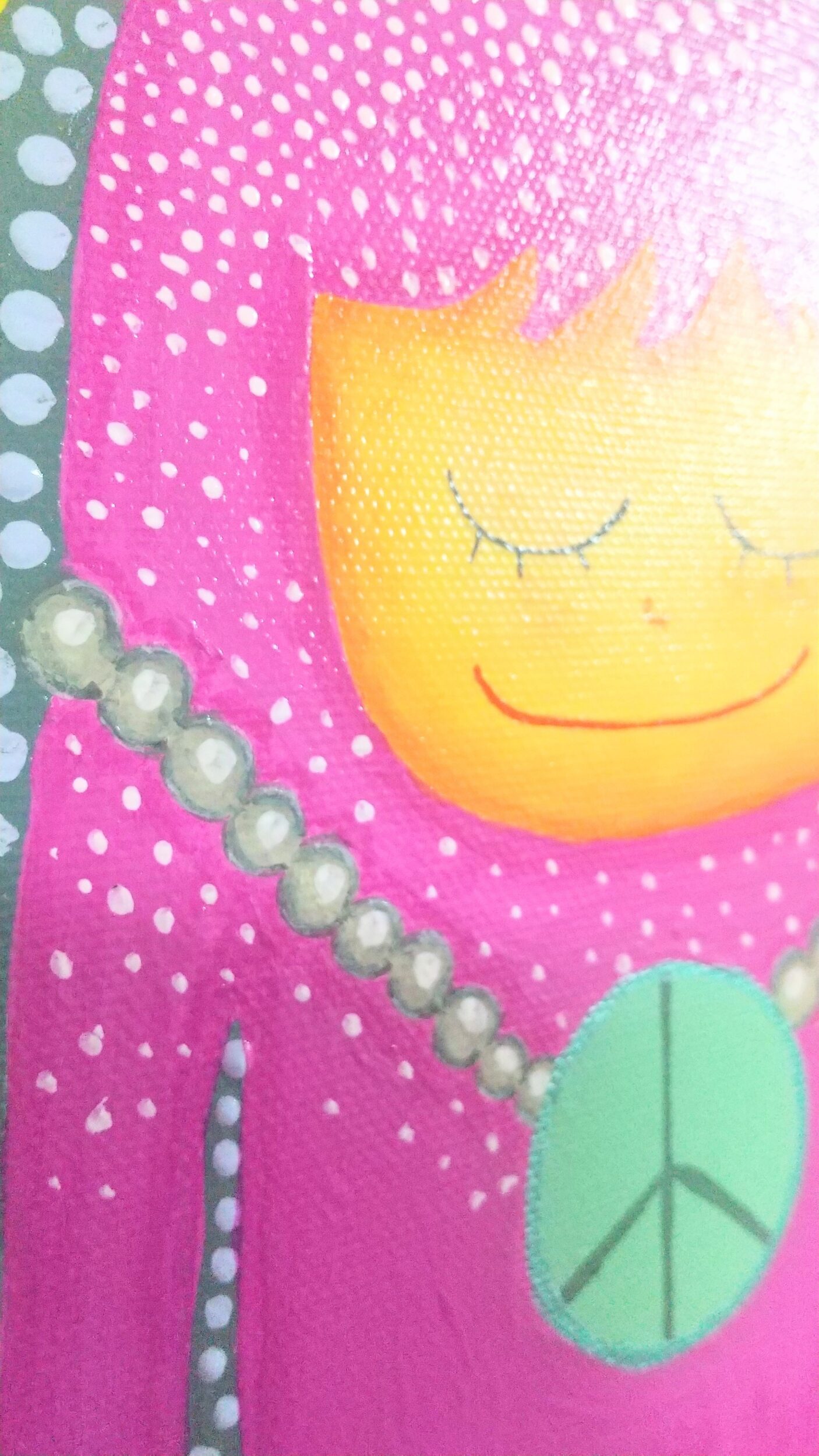 平和な世界が無限に広がっている。丸の世界に住んでいるマルちゃんが地球上の生物達も穏やかで幸せな人生を送れるように祈っています。この作品はキャンバスにアクリル絵の具で描いていて表面にクリスタルバーニッシを塗りほこりや有害ガスから作品を保護している。