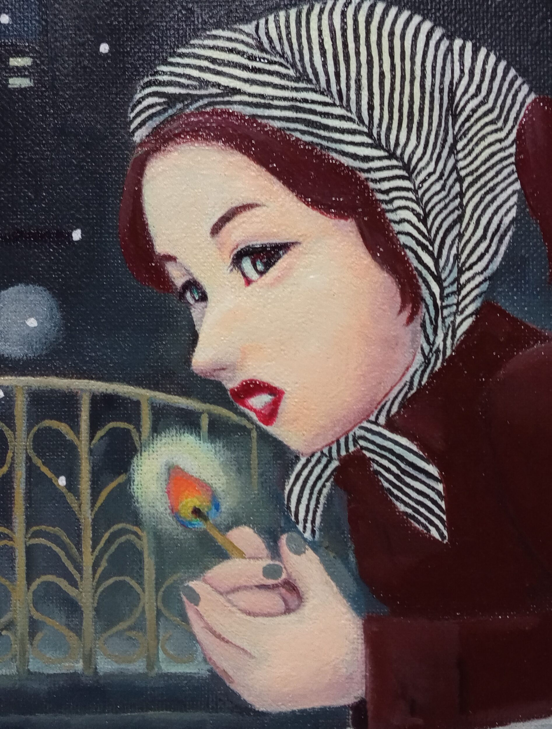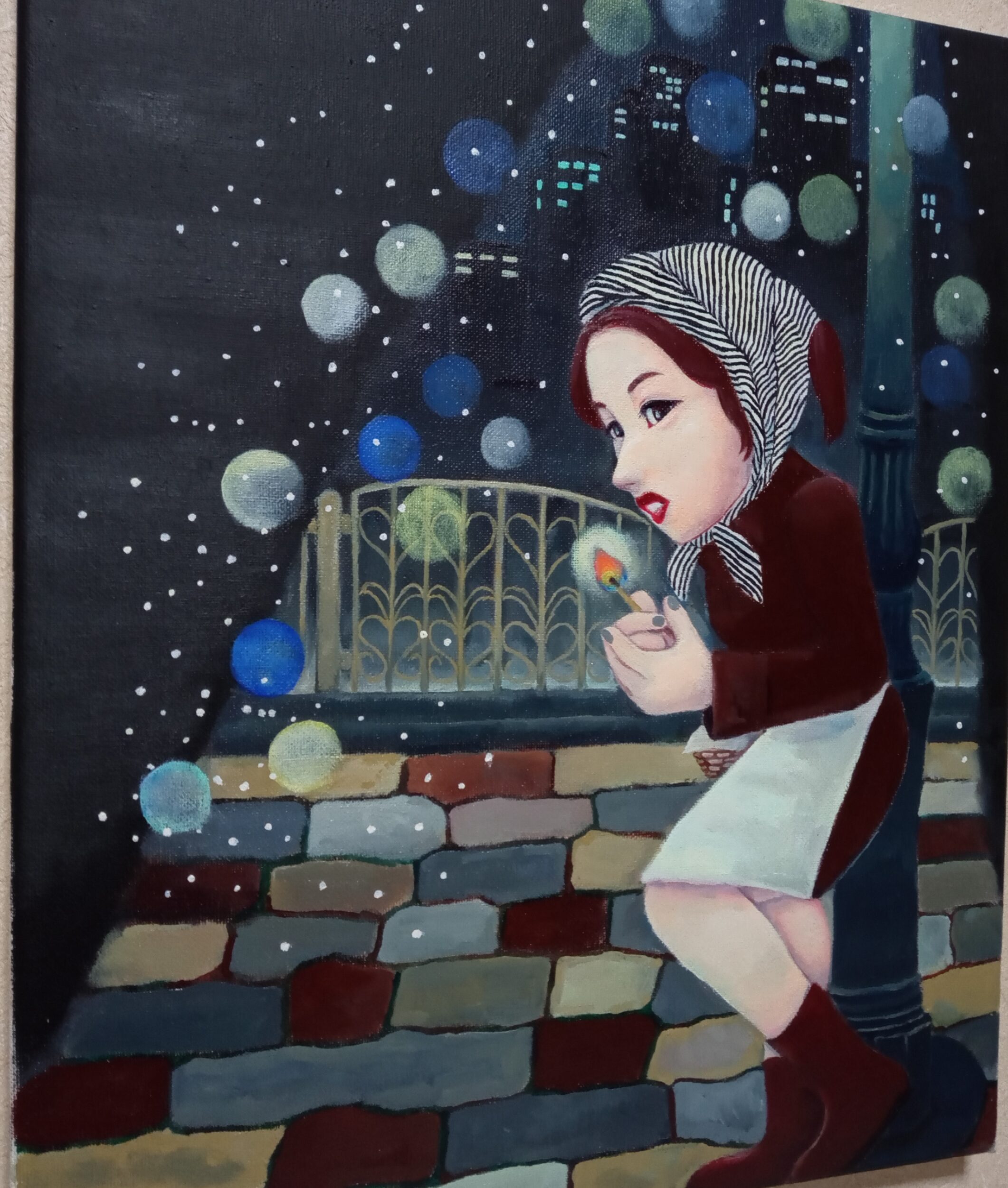 油彩画キャンバス F8号 series Women㉗ 今を生きる女性をスパイスを効かせた愛で表現しました。 寒い寒い冬の夜空の下、少女はマッチを売っています。売っているのはマッチだけだと思います、今のところ…