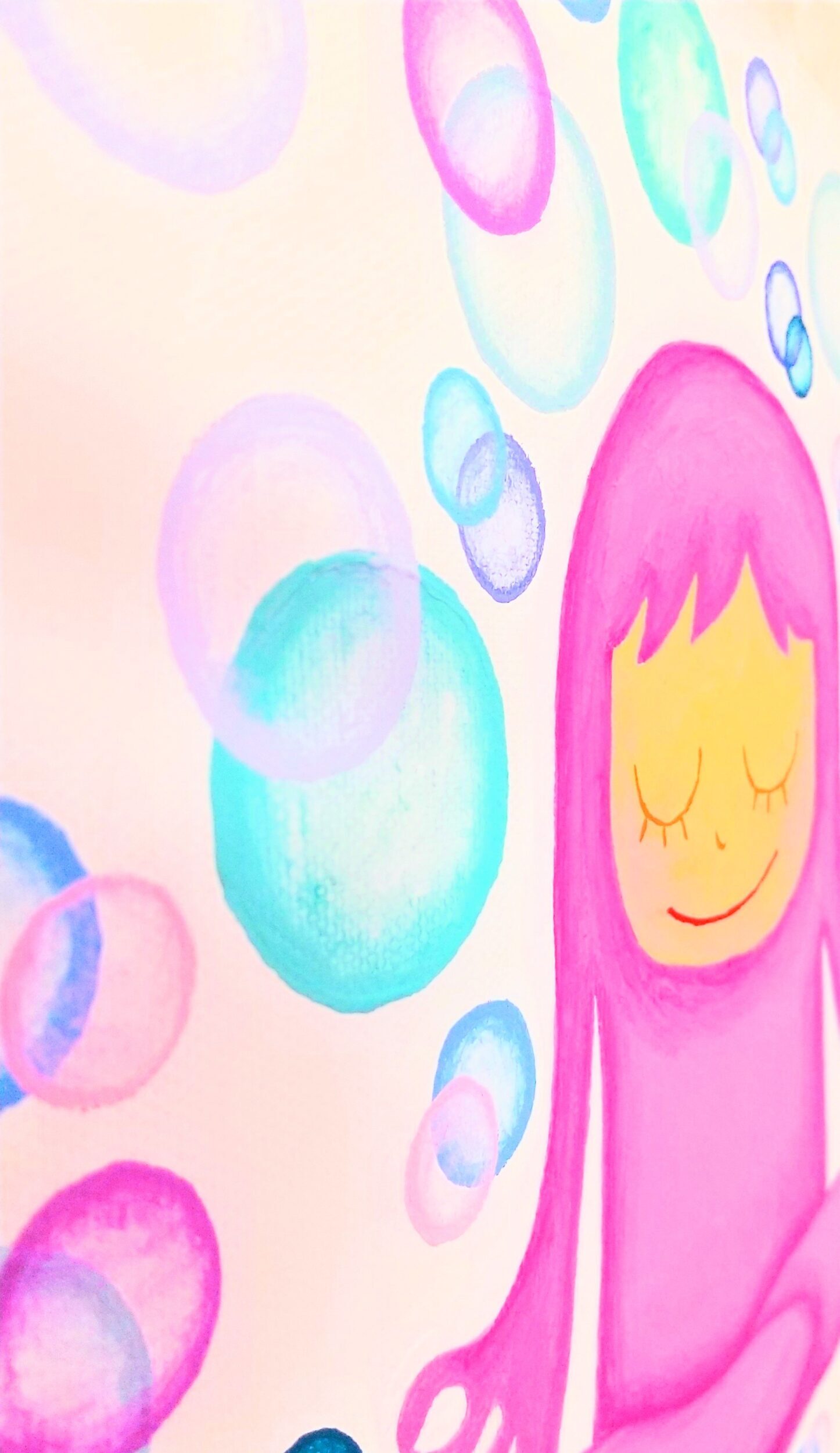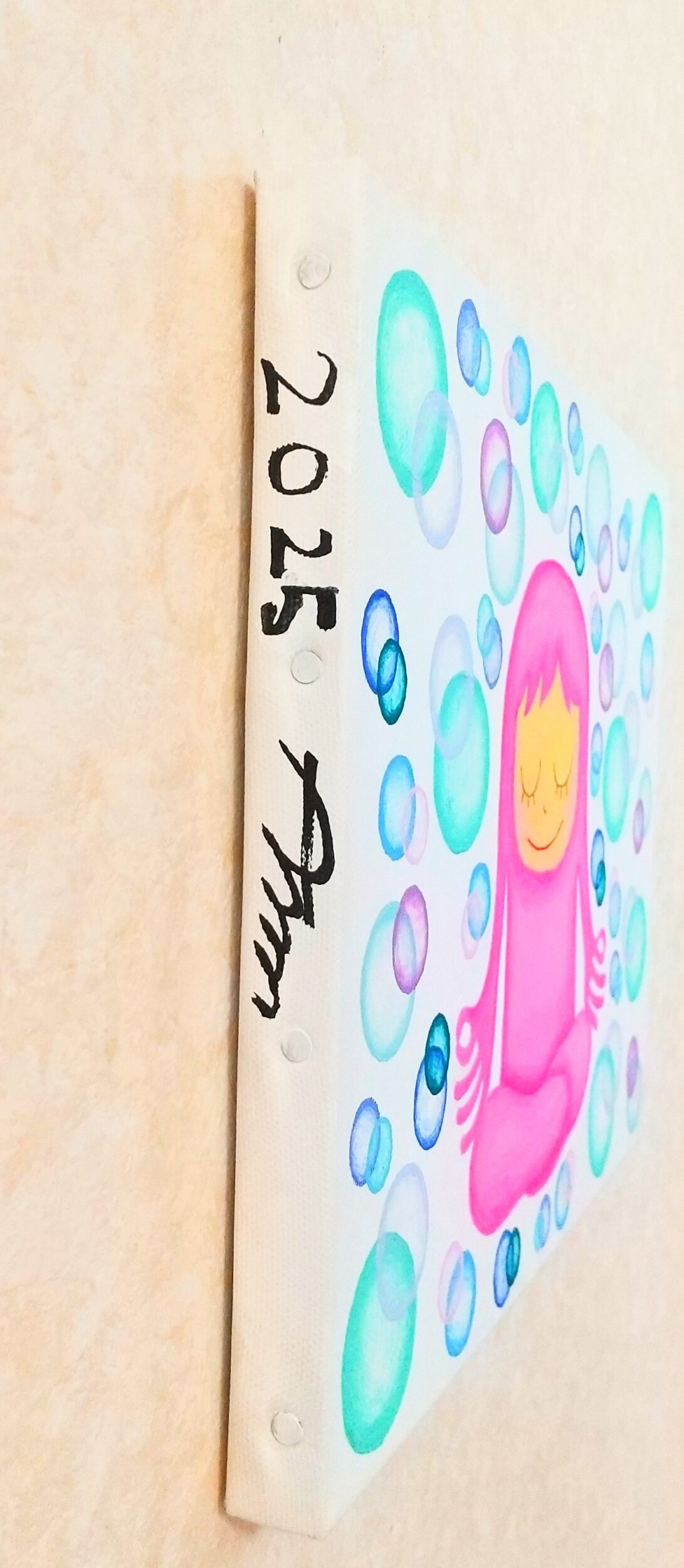 地球上の生物達が戦争や自然災害、気候変動、事故、事件などにさらされ苦しんだり悲しんだりする姿を見て丸の世界の生物達も心を痛めている。宇宙の片隅に存在する小さな地球に暮らす生物達が平和に暮らせる事を遠い銀河系から遥か彼方に存在する架空の惑星、丸の世界の生物達は常に祈っている。この作品はキャンバスにアクリル絵の具で描いていてクリスタルバーニッシュで表面を保護している。