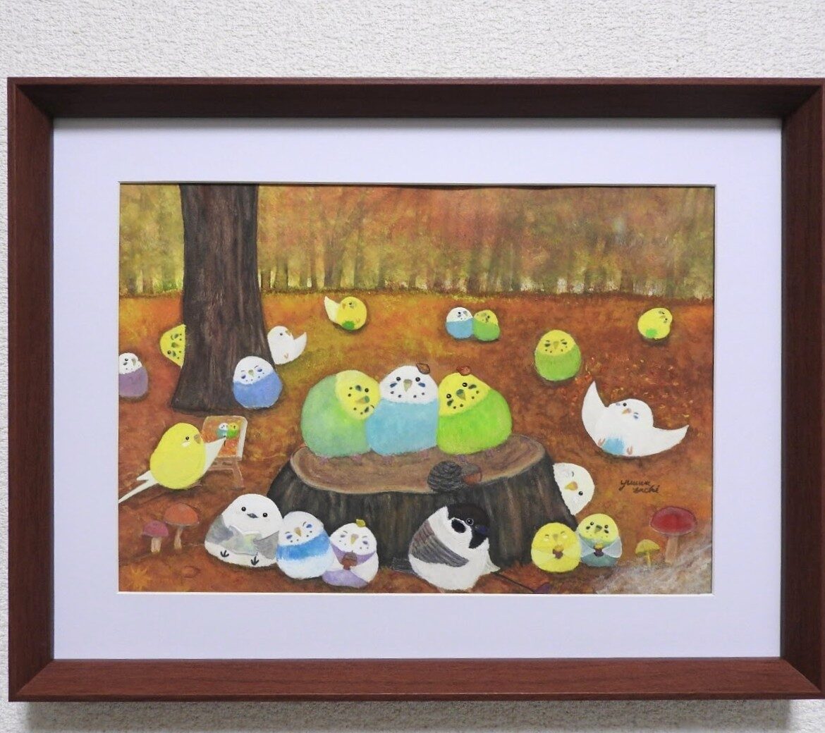 額入り原画A4『思い出の瞬間』 鳥 セキセイインコ シマエナガ スズメ 花火 夏 野鳥 文鳥