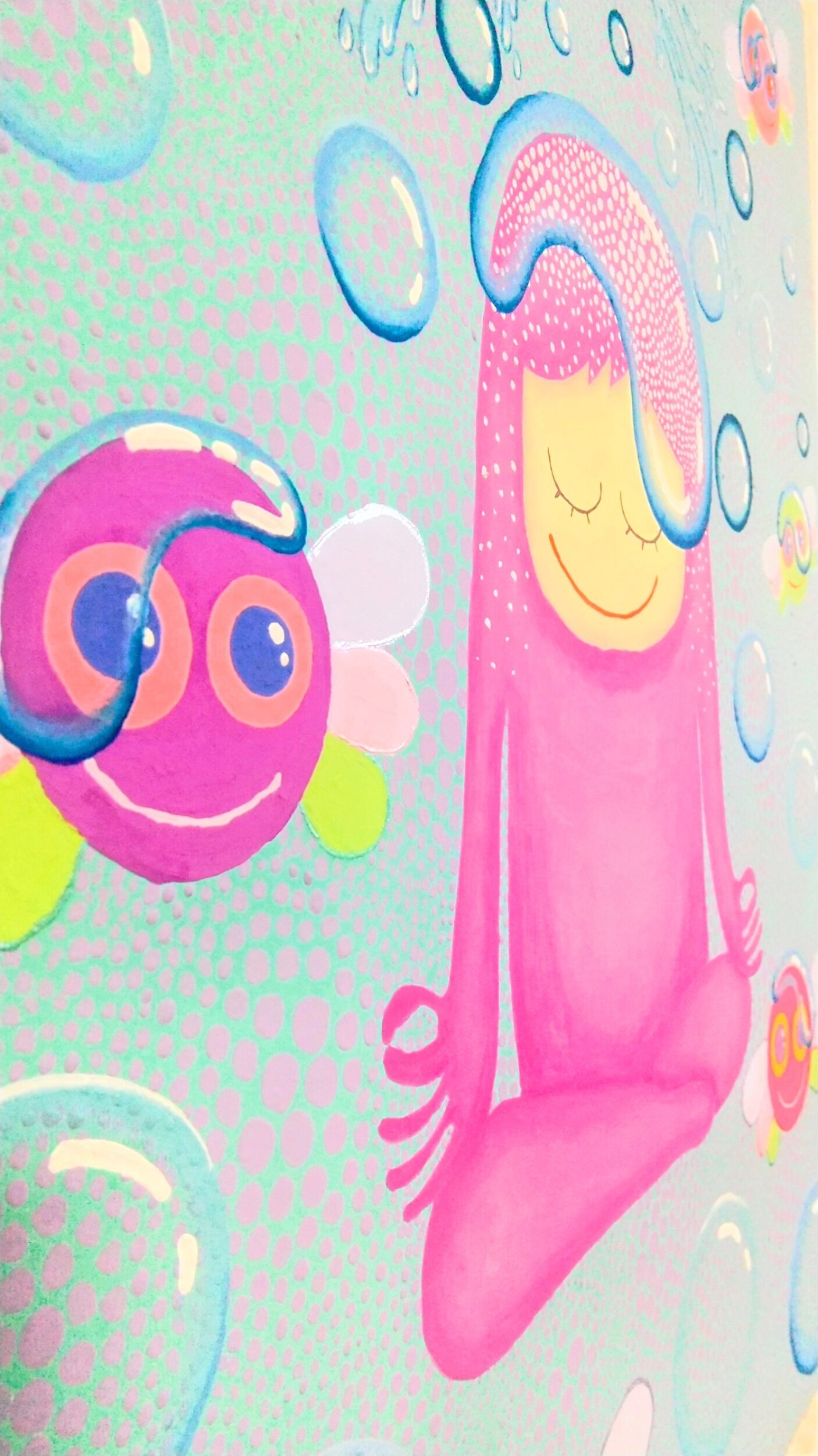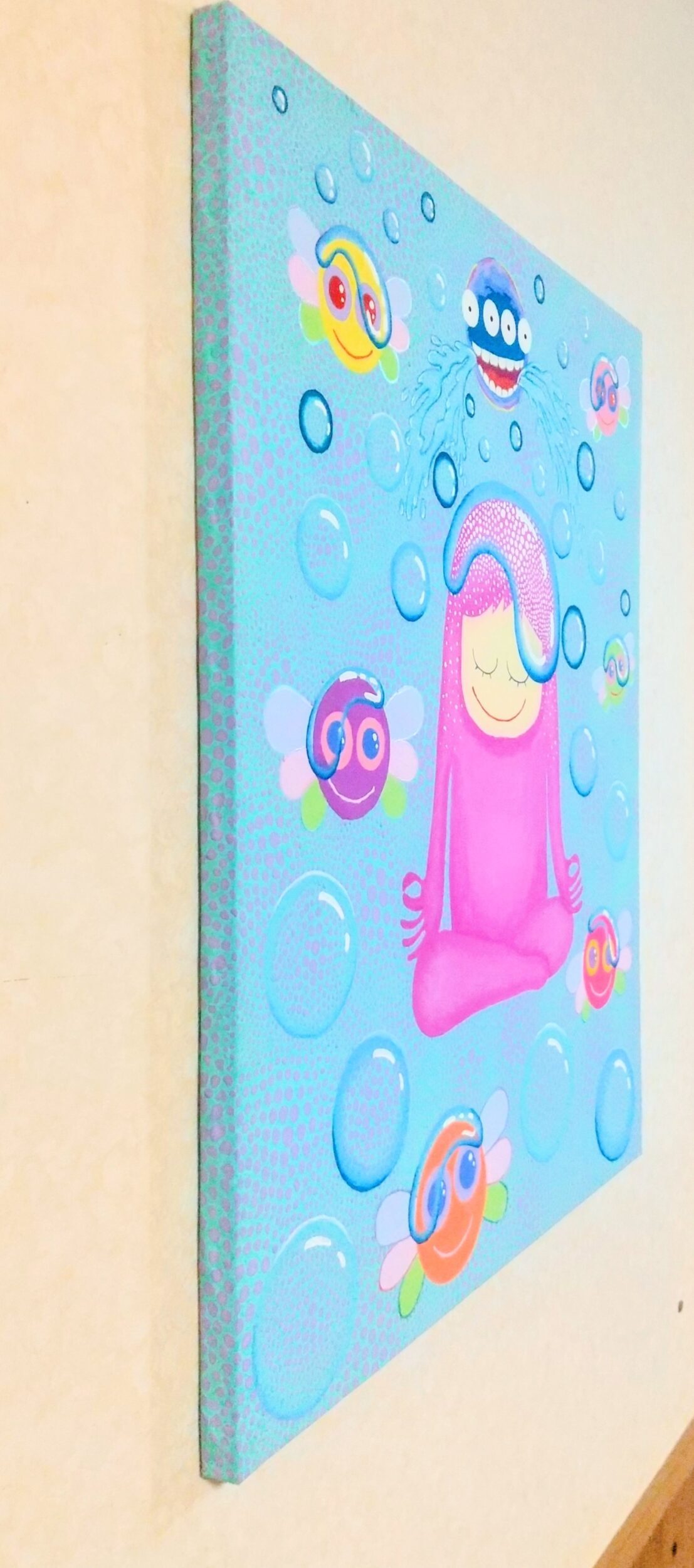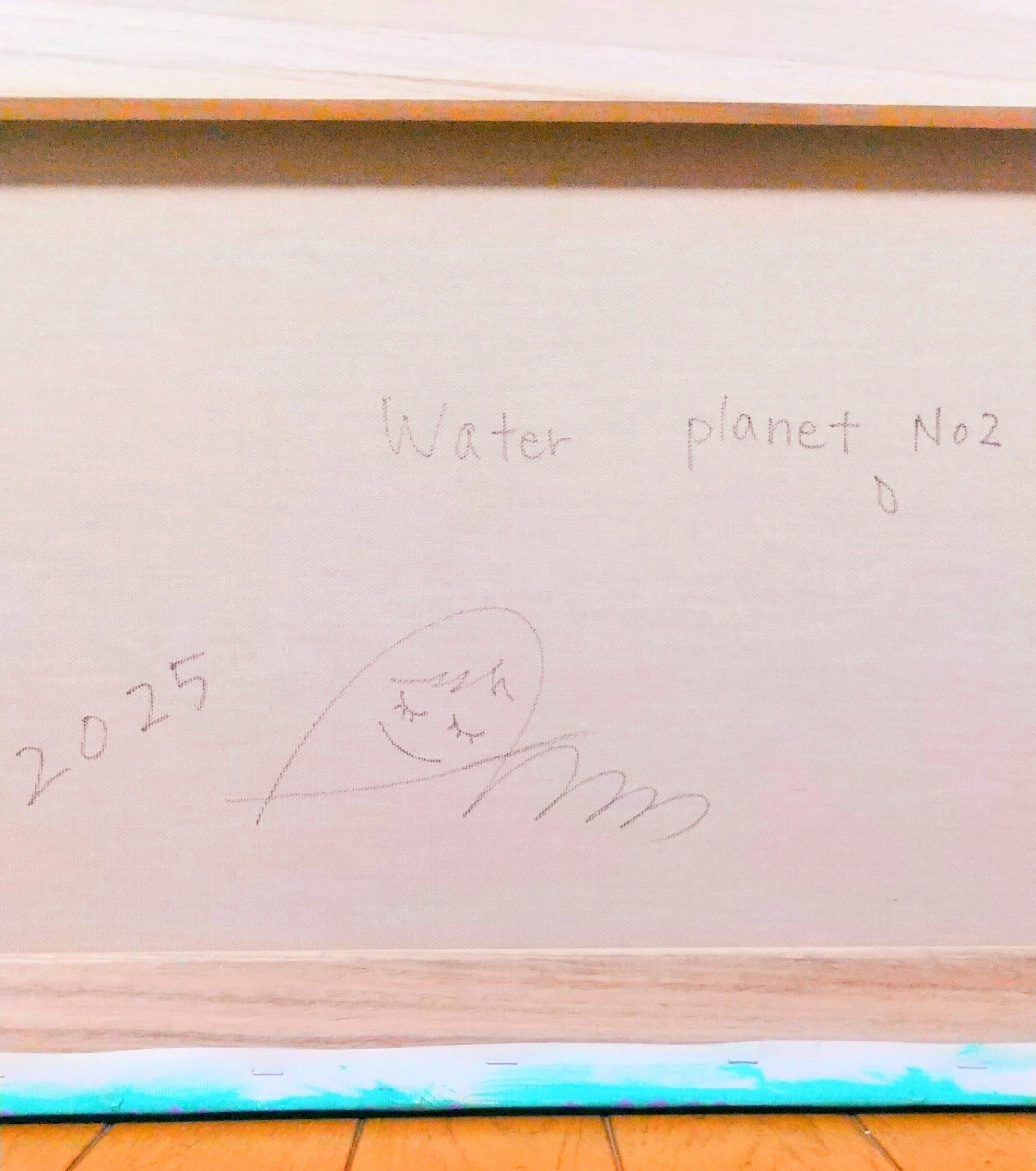 水害によって生物達を飲み込んでしまう水なのに水を嫌いにはなれない、綺麗な水を見れば嬉しくなるし癒される、水は生物にとって命の水。丸の世界ではポタが自分の体の中で綺麗な水を作り出せる為、綺麗な水を必要としている生物達を見つけて届けてくれる。ポタは丸の世界に無くてはならない存在です。この作品はキャンバスにアクリル絵の具で描いていて表面にクリスタルバーニッシを塗りほこりや有害ガスから作品を保護している。